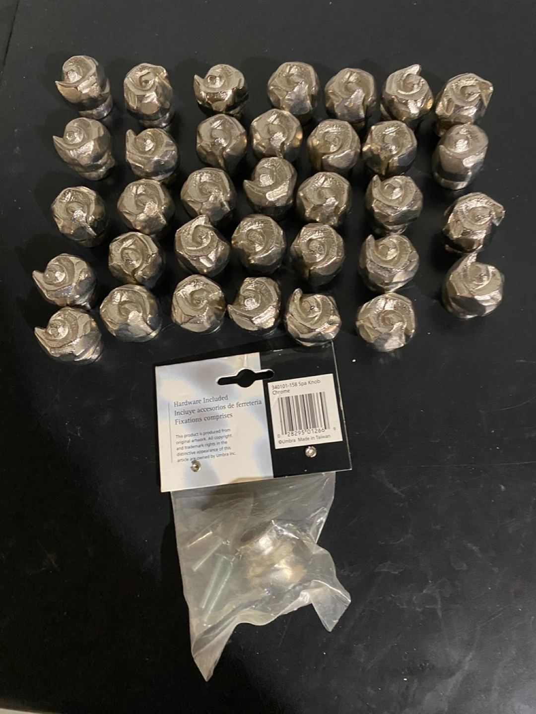 Selling a set of 32 Umbra SPA drawer knobs with a chrome finish! These knobs are brand new and still in their original packaging, complete with all the necessary hardware for installation. They're a great way to add a touch of elegance to your furniture or cabinets
