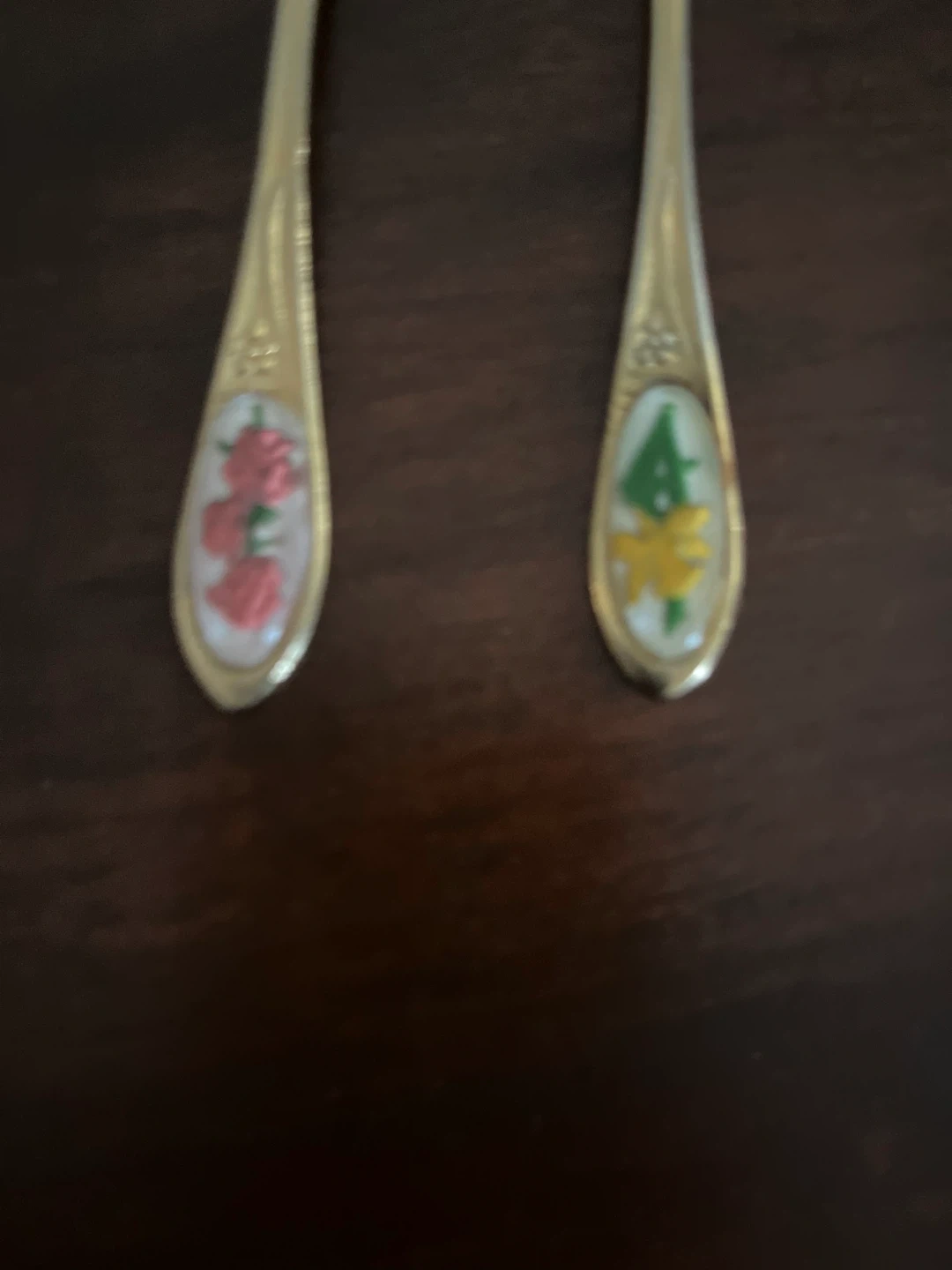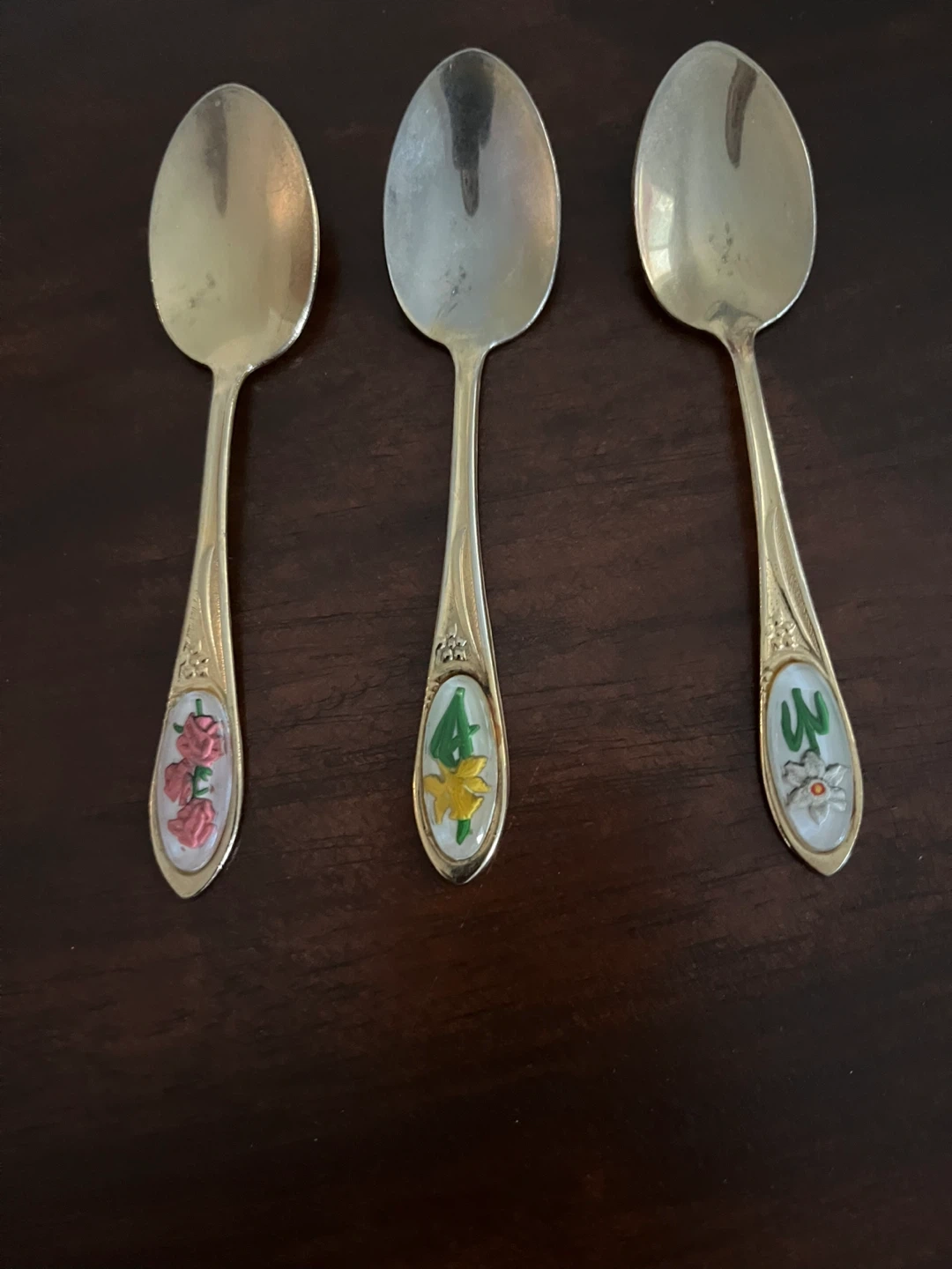 Selling a set of three vintage souvenir spoons. Each spoon features a different floral design on the handle: roses, daffodils, and a cactus flower. They're in good condition for their age!