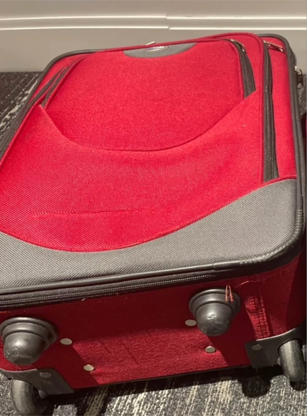 Selling a red American Tourister carry-on suitcase. It's in good condition and ready for your next trip! It has a spacious interior and smooth-rolling wheels.