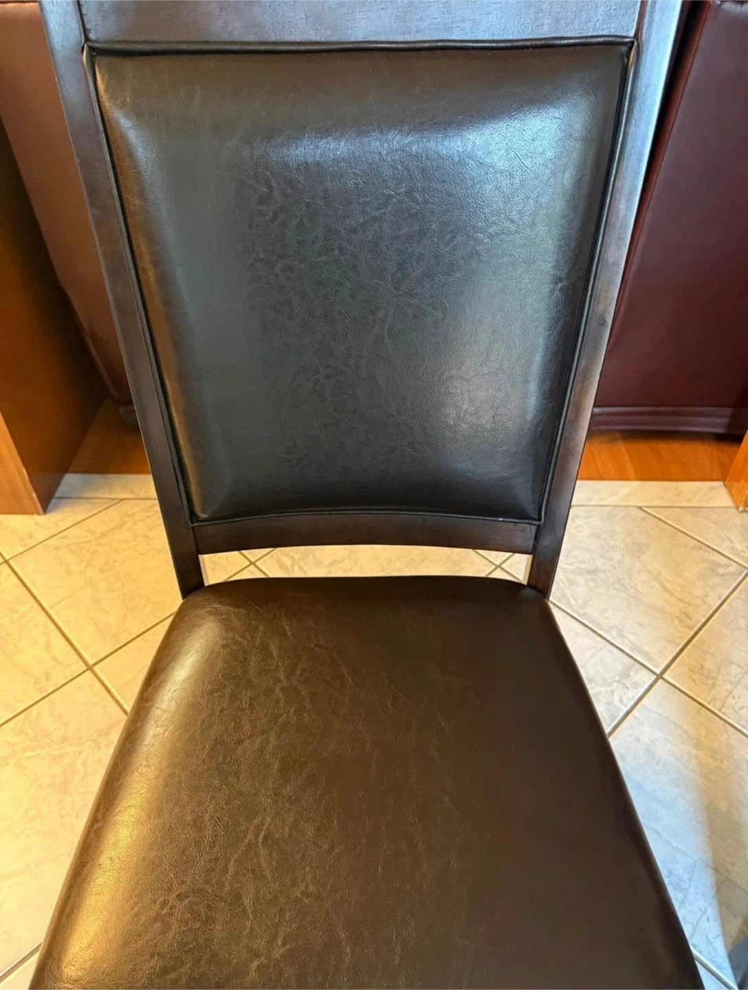 Selling a dark brown dining table that comes with six chairs. The table has a few visible signs of use, such as some water ring marks, but it's still in good condition for everyday use. See photos. Could be a project piece.