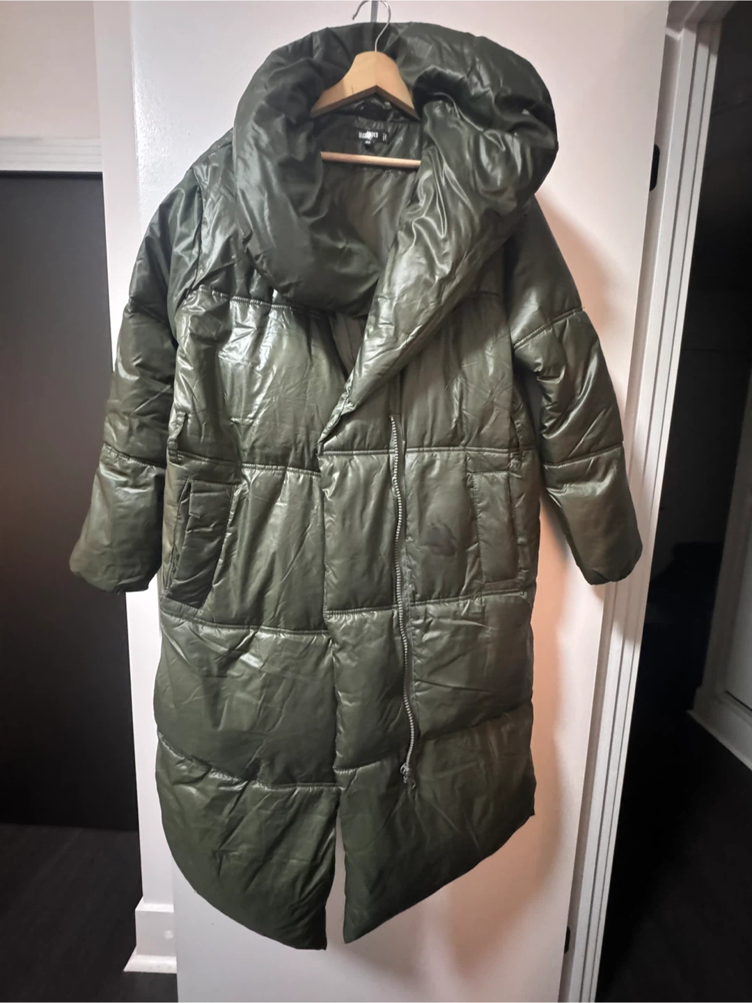 Selling a Missguided puffer coat in great condition! It's a size US 2. This stylish coat is perfect for staying warm and fashionable during the colder months. The khaki green colour is really versatile. It also has a tie around the waist!
