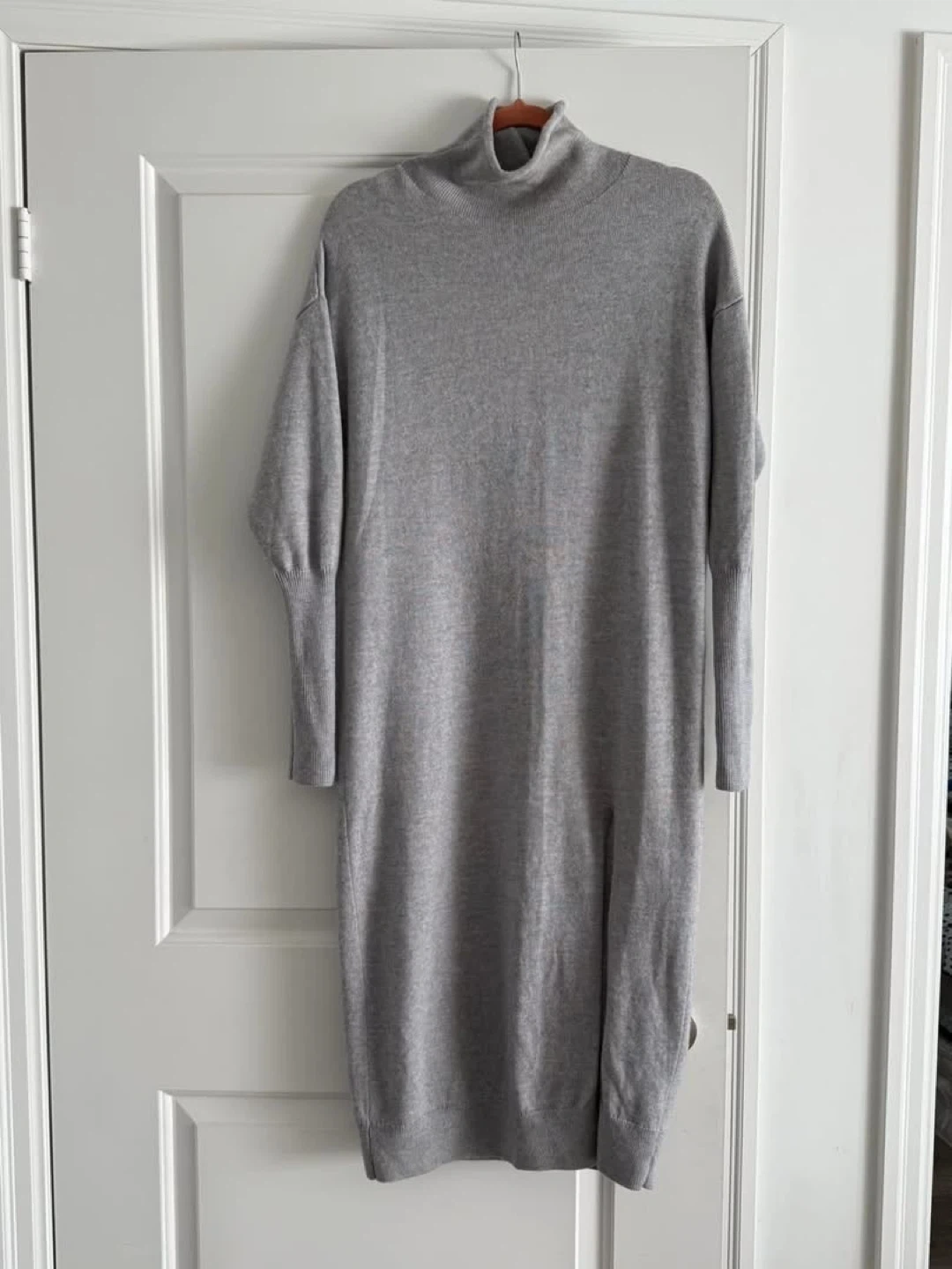 Selling a comfy Wilfred grey knit turtleneck dress! It's in great condition and perfect for staying cozy during the cooler months. The dress has a stylish slit on the side, adding a touch of flair to the classic turtleneck design