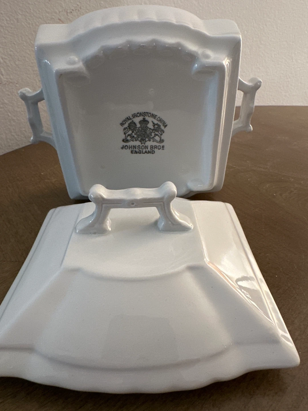 Selling a Royal Ironstone China dish by Johnson Bros England. This white dish is perfect for serving or display. It is in good condition and ready for a new home!