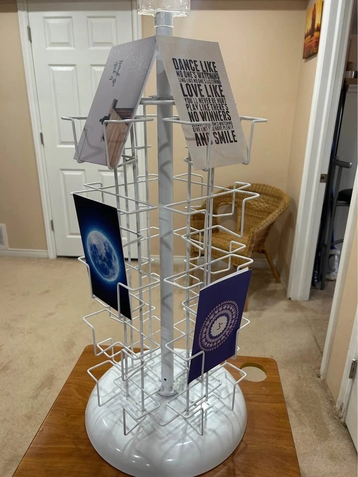 Sturdy 20-pocket rotating postcard and greeting card display rack. Made of durable white metal with a 360° spinning base. Perfect for retail stores, craft show vendors, market booths, boutiques, offices, and anyone selling or displaying postcards or greeting cards.