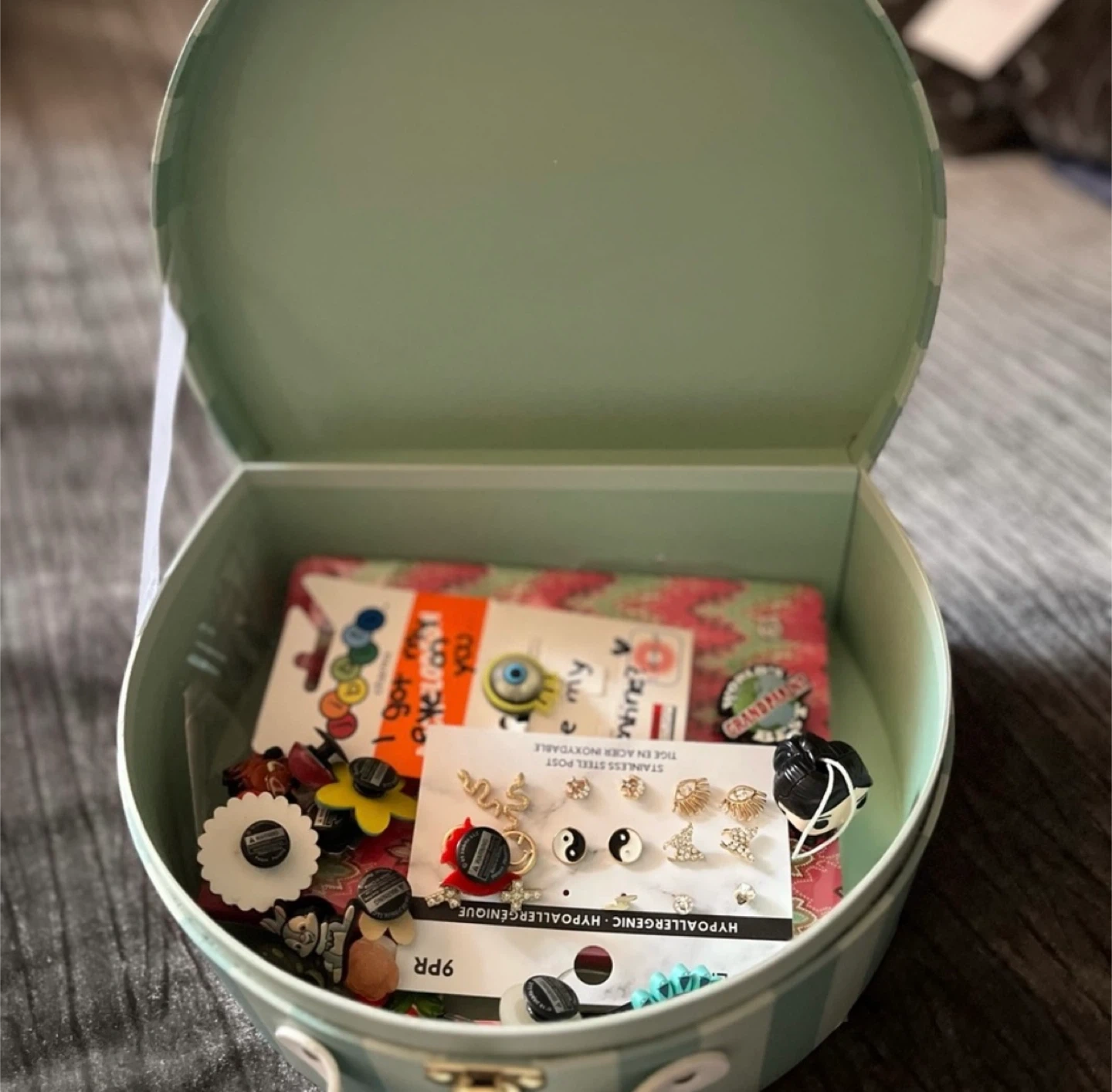 I'm selling a variety of crocs Jibbitz charms and Ardene hypoallergenic earrings a note book and more in a cute box. There are several different styles of charms and stainless steel post earrings! They are all in great condition