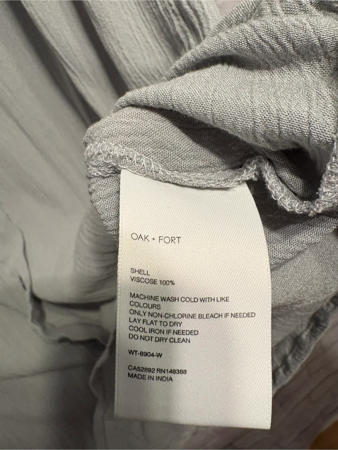 Here's a cute Oak + Fort button-up shirt in size XS/S! It's made in India and the shell is 100% viscose. It's recommended to machine wash cold with like colours, only use non-chlorine bleach if needed, lay flat to dry, cool iron if needed, and do not dry clean. Excellent condition, pick up only.