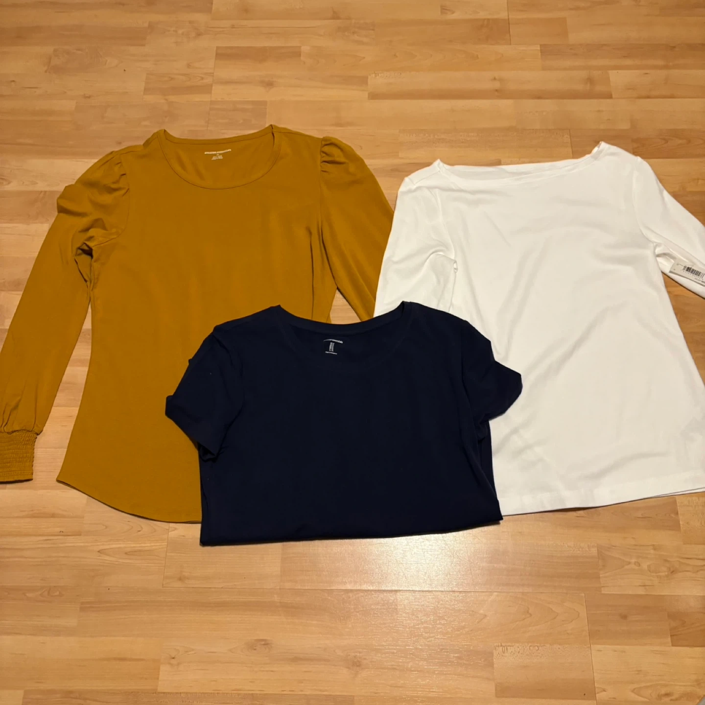 Selling a set of women's shirts from Amazon Essentials. Includes a white long-sleeved shirt, a mustard-yellow long-sleeved shirt with puff sleeves, and a navy blue short-sleeved shirt. All are size medium and are new with or without tag. Price for all, pick up only.