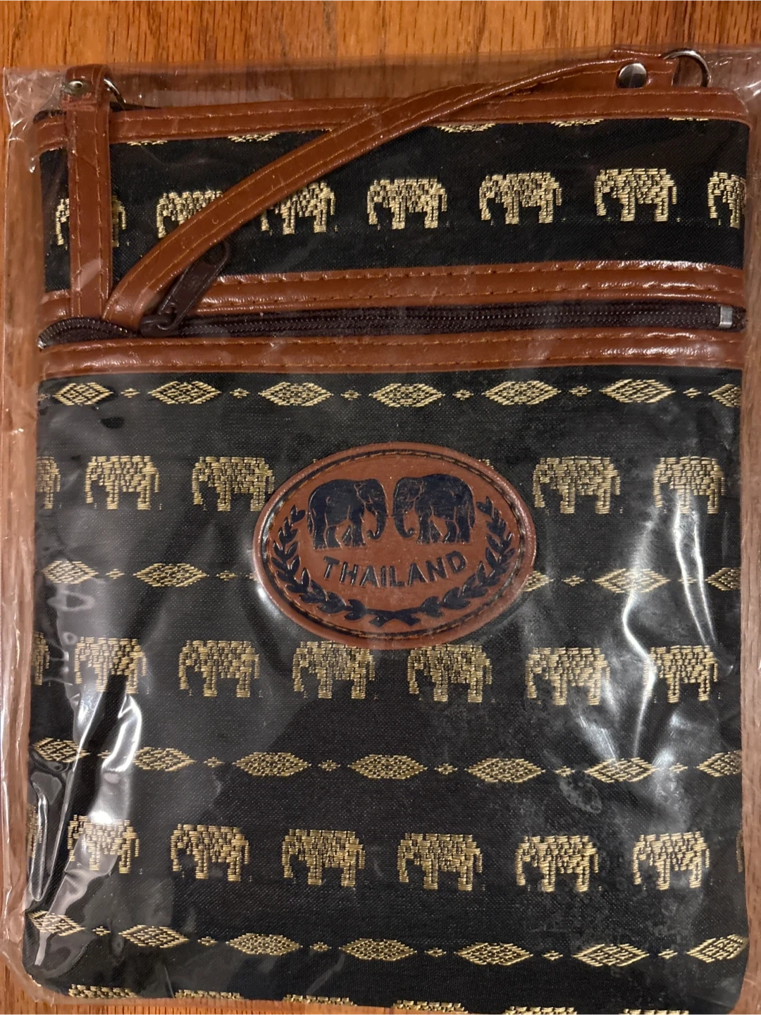 This crossbody bag features a unique Thailand-inspired elephant pattern. It's brand new and still in its original packaging! The bag has a convenient zipper and a leather strap.