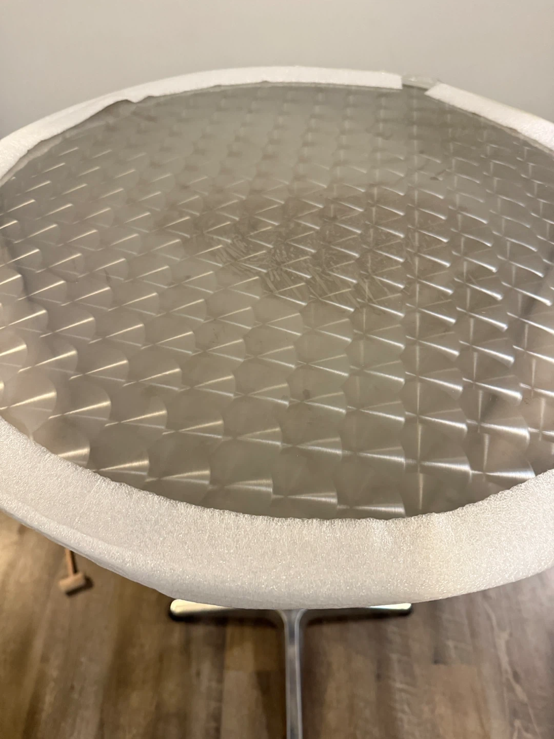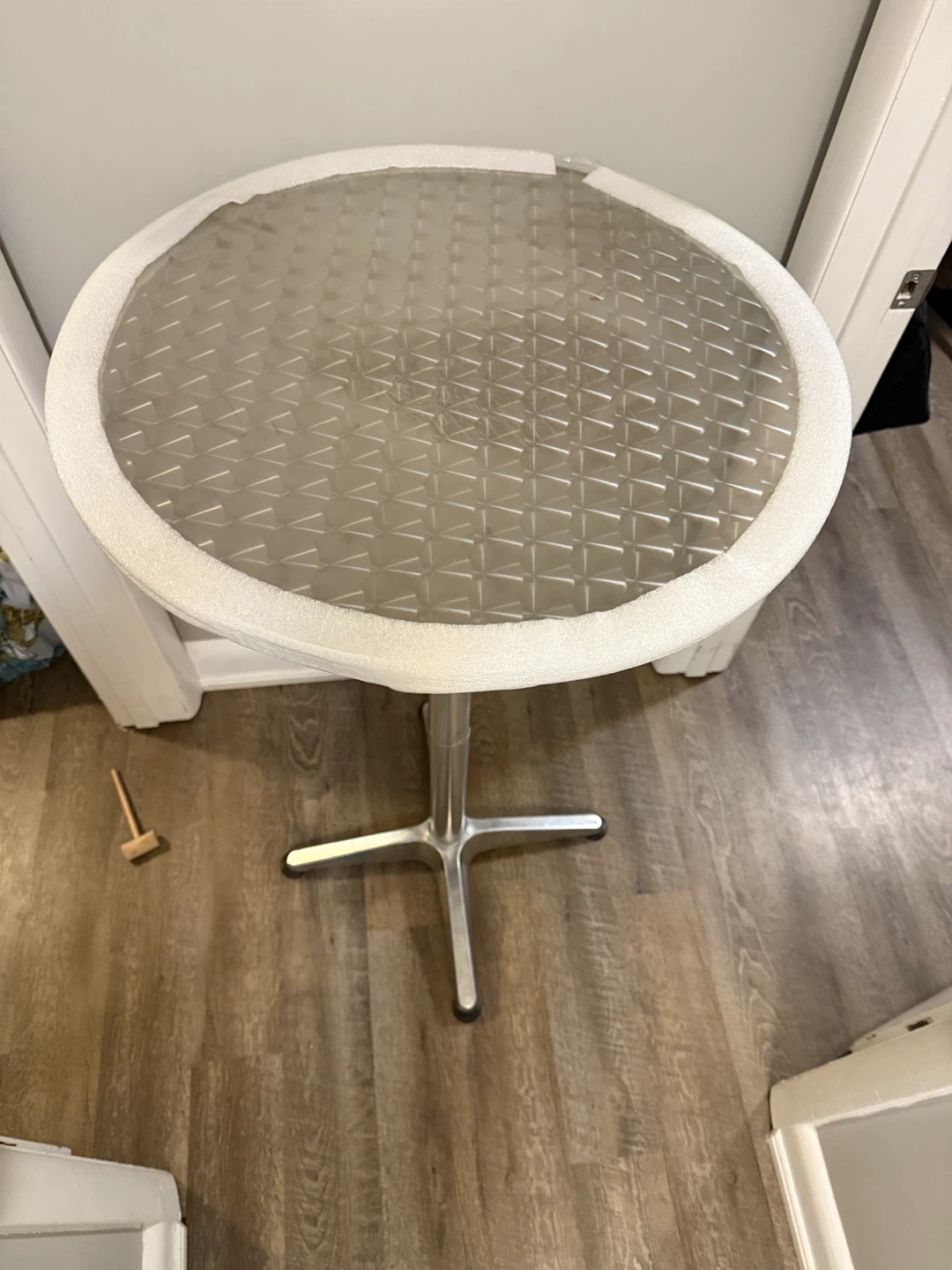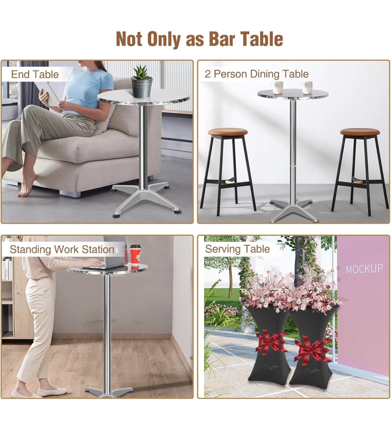 Selling a height-adjustable round bar table! It has a sleek, modern design with a silver base and a round top. The table's height can be adjusted to suit your needs. It has a weight capacity of 110-165lbs/50-75kg and weighs 16.9lbs/7.7kg. Perfect for a small space or a bar area!