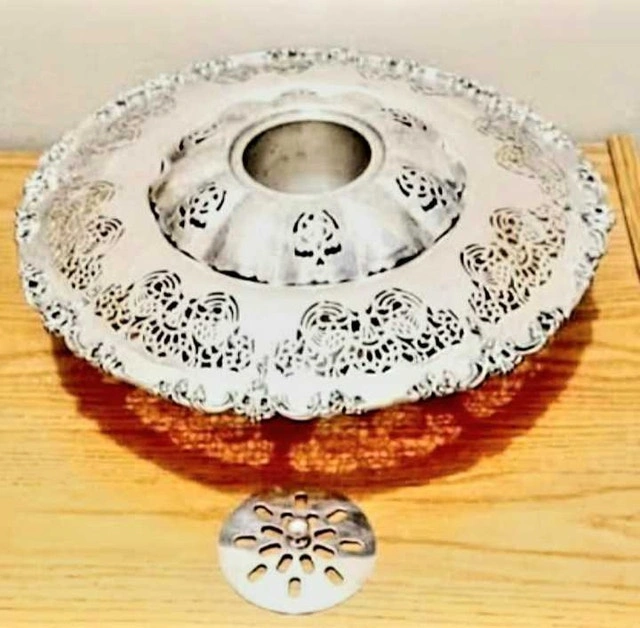 1940's, Very Rare Stamped, Silver Plated E.P. 3 Pcs Reticulated & Embossed Copper, Flower Frog, also known as a Kenzan, in a Chinoiserie Chinese style. Ornate Cut-out detailing around the rim and a removable Flower Frog insert helping Arrange Flowers in Place features intricate detailing and a classic design. It is in good condition Made by Essay, Canada