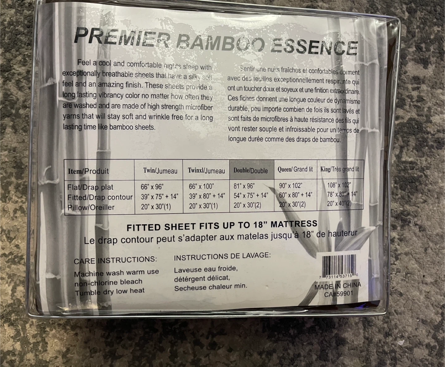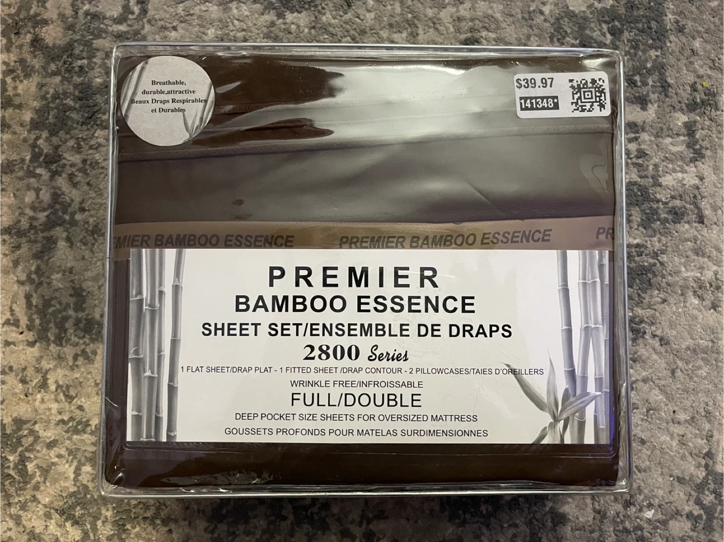 Selling a brand new Premier Bamboo Essence sheet set in full/double size! The set includes 1 flat sheet, 1 fitted sheet, and 2 pillowcases. These sheets are wrinkle-free and made for oversized mattresses. Originally bought for $39.97!