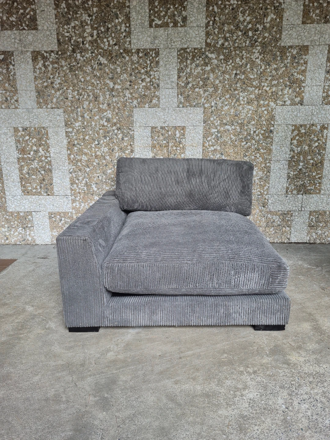 Selling a comfy grey corduroy sectional sofa by Moes. It's in great shape and would be perfect for a living room or den. The corduroy material gives it a nice, cozy texture. It's a stylish and comfortable piece of furniture.