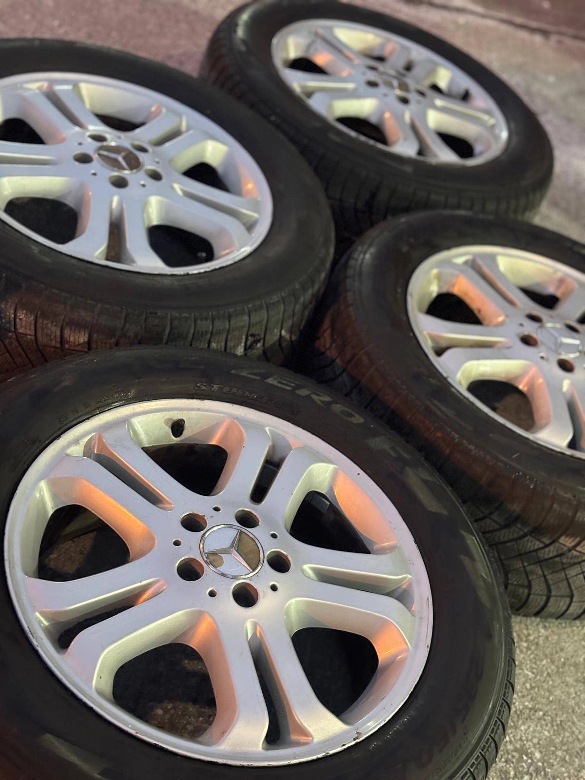 Set of four authentic 18 inch Mercedes wheels with 235 60 R18 (front) and 255 55 R18 (rear) Pirelli Winter Ice Zero FR winter / snow tires mounted and balanced on them