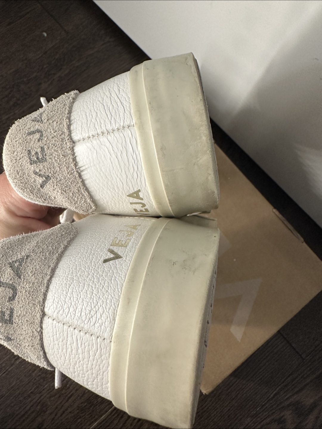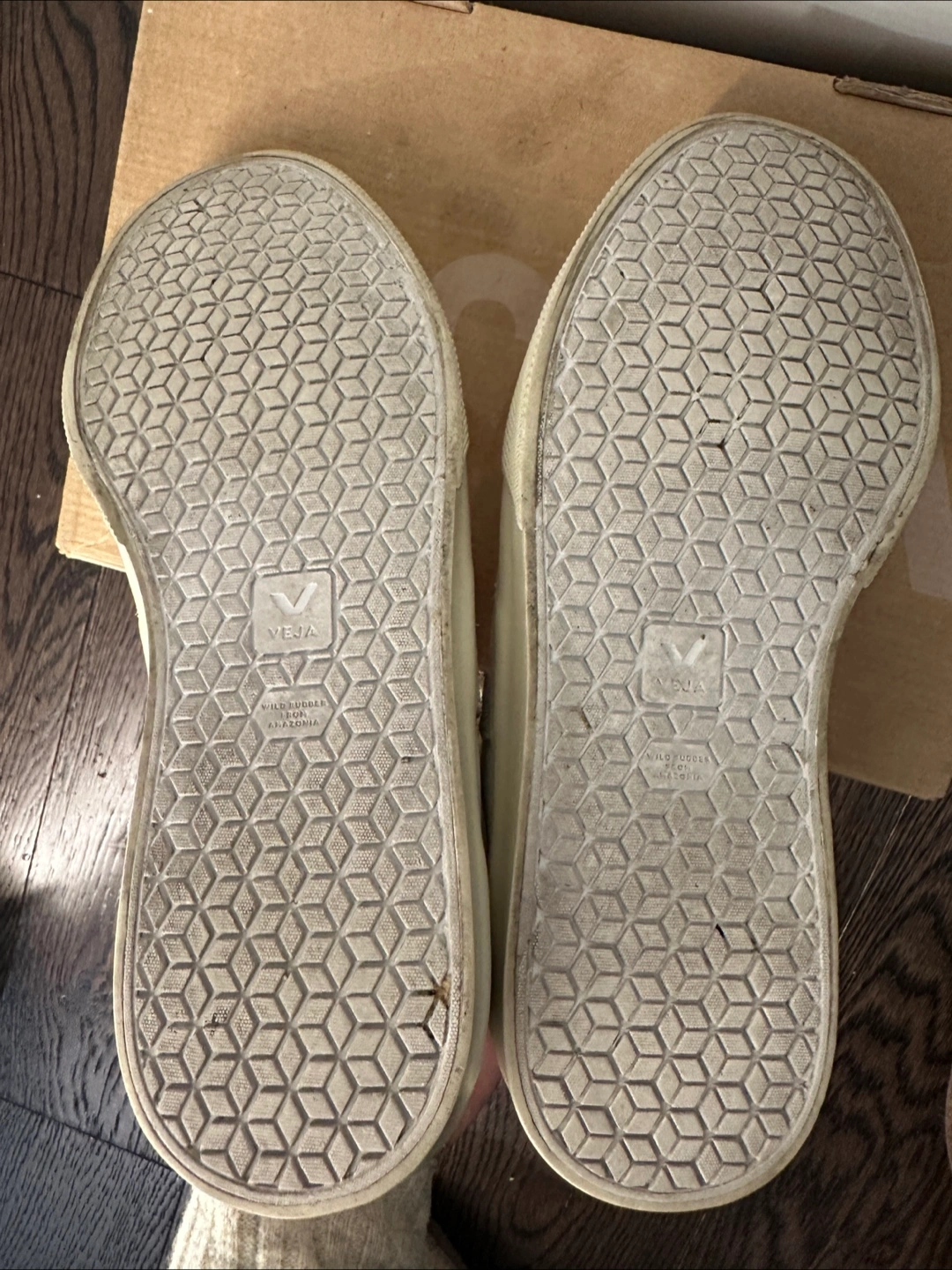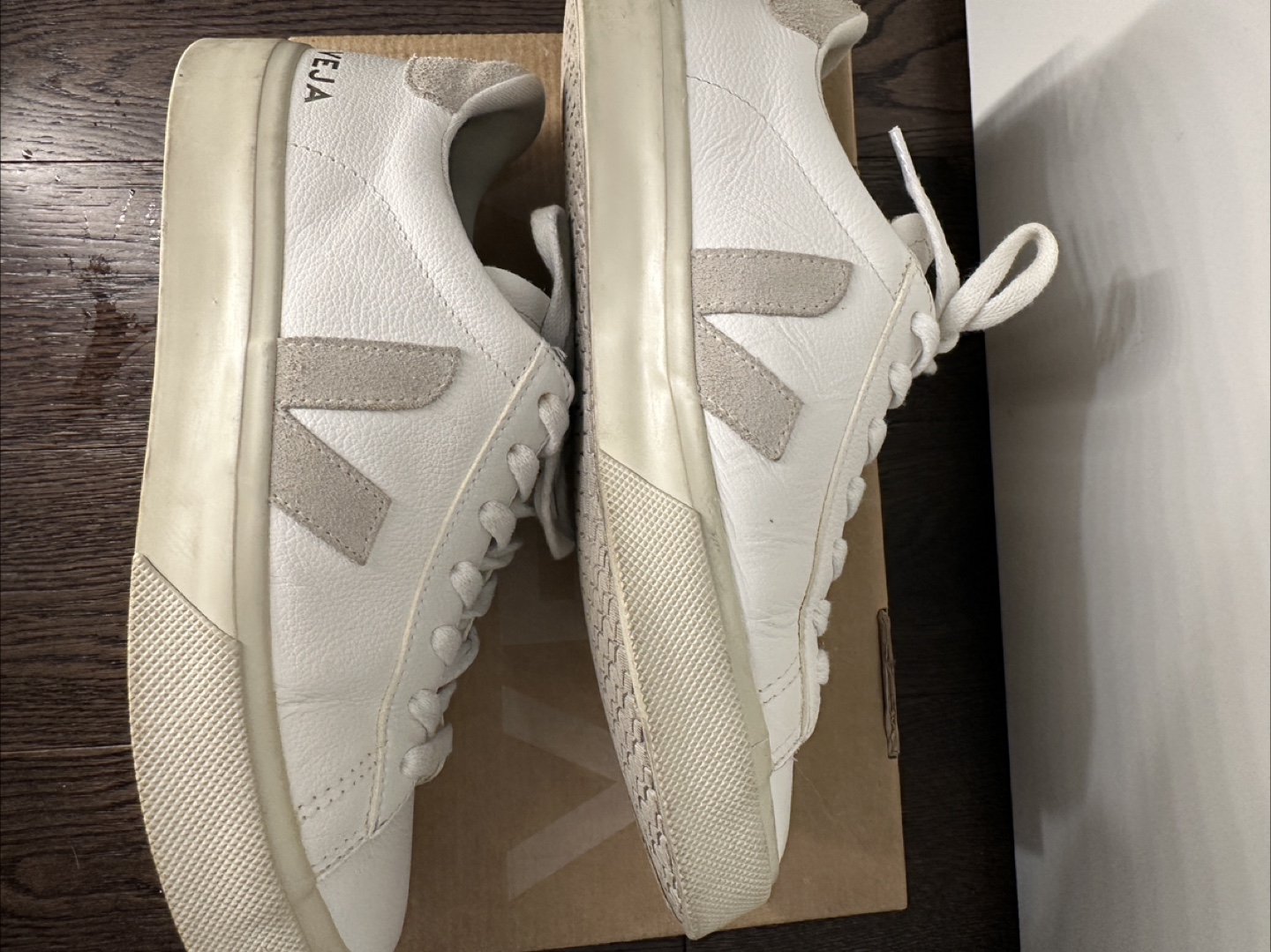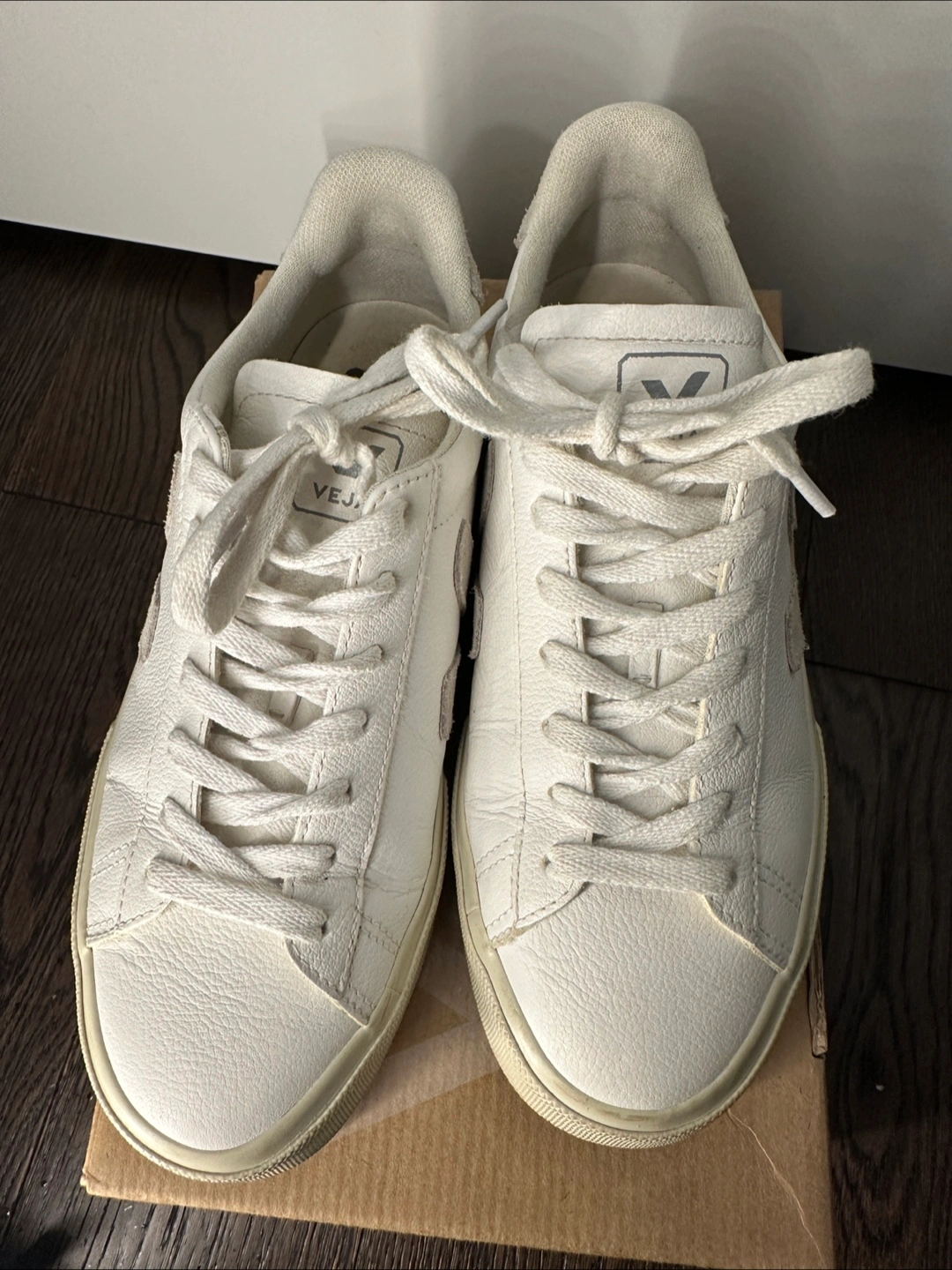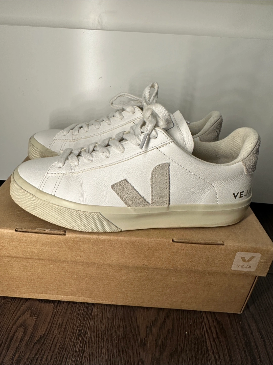 White Vejas with beige v logo. Size 8.