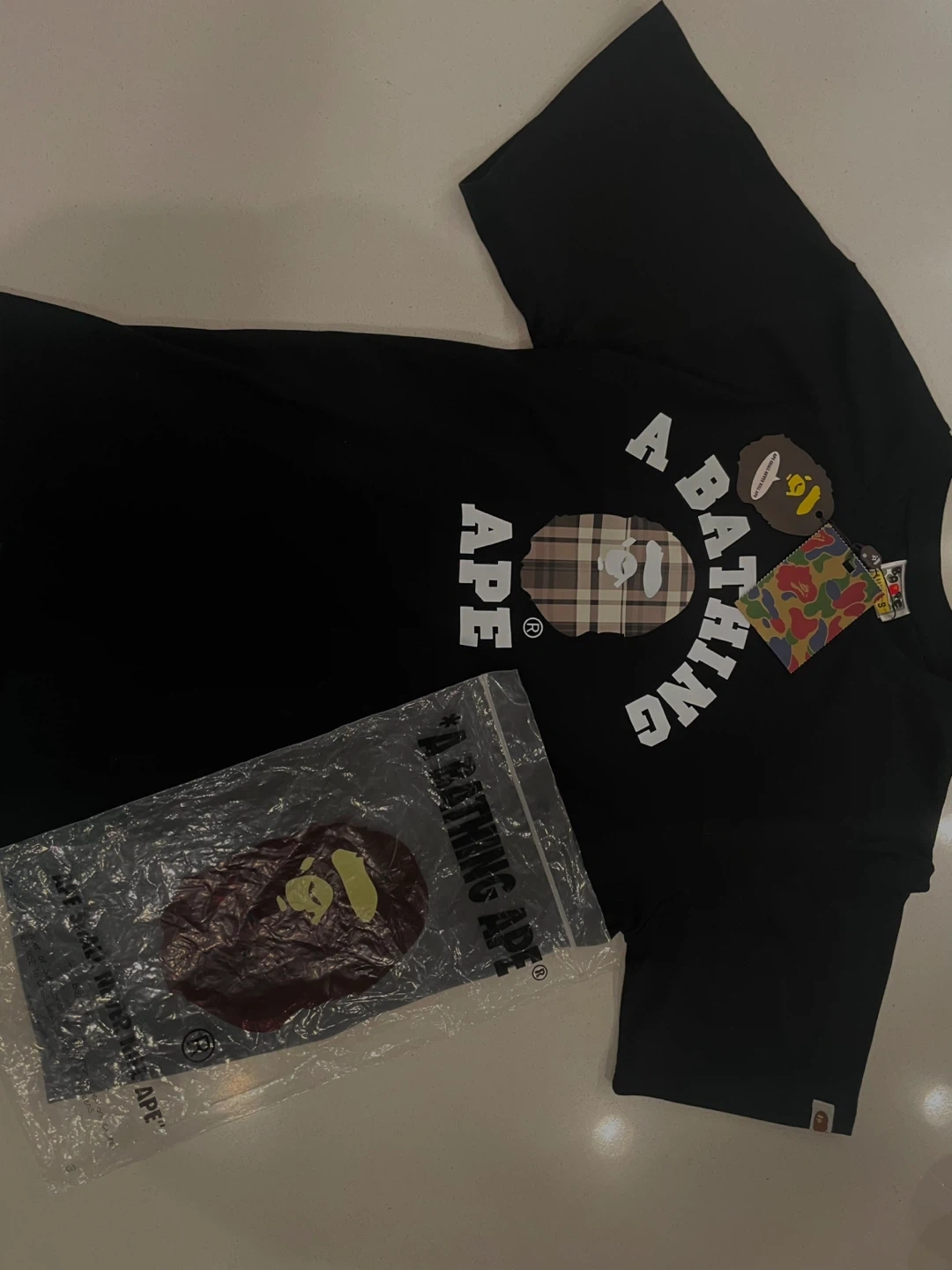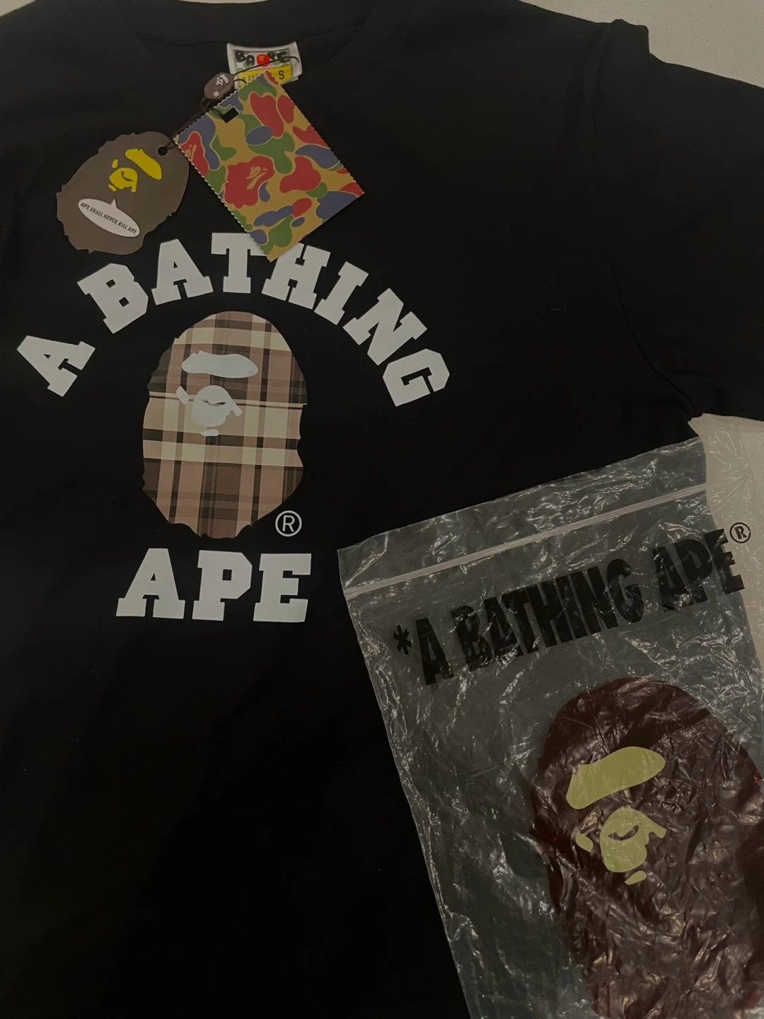 Selling a black A Bathing Ape (BAPE) T-shirt. It features the iconic BAPE logo with a unique plaid pattern. The shirt is in great condition and comes with the original packaging. Perfect for any BAPE fan!