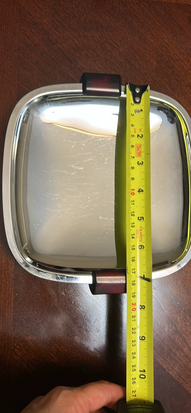 Selling a set of 2 vintage stainless steel carving tray and a square serving dish. They both have nice dark red handles. The carving tray is about 18 inches long and the serving dish is about 10 inches wide. They are in good condition!