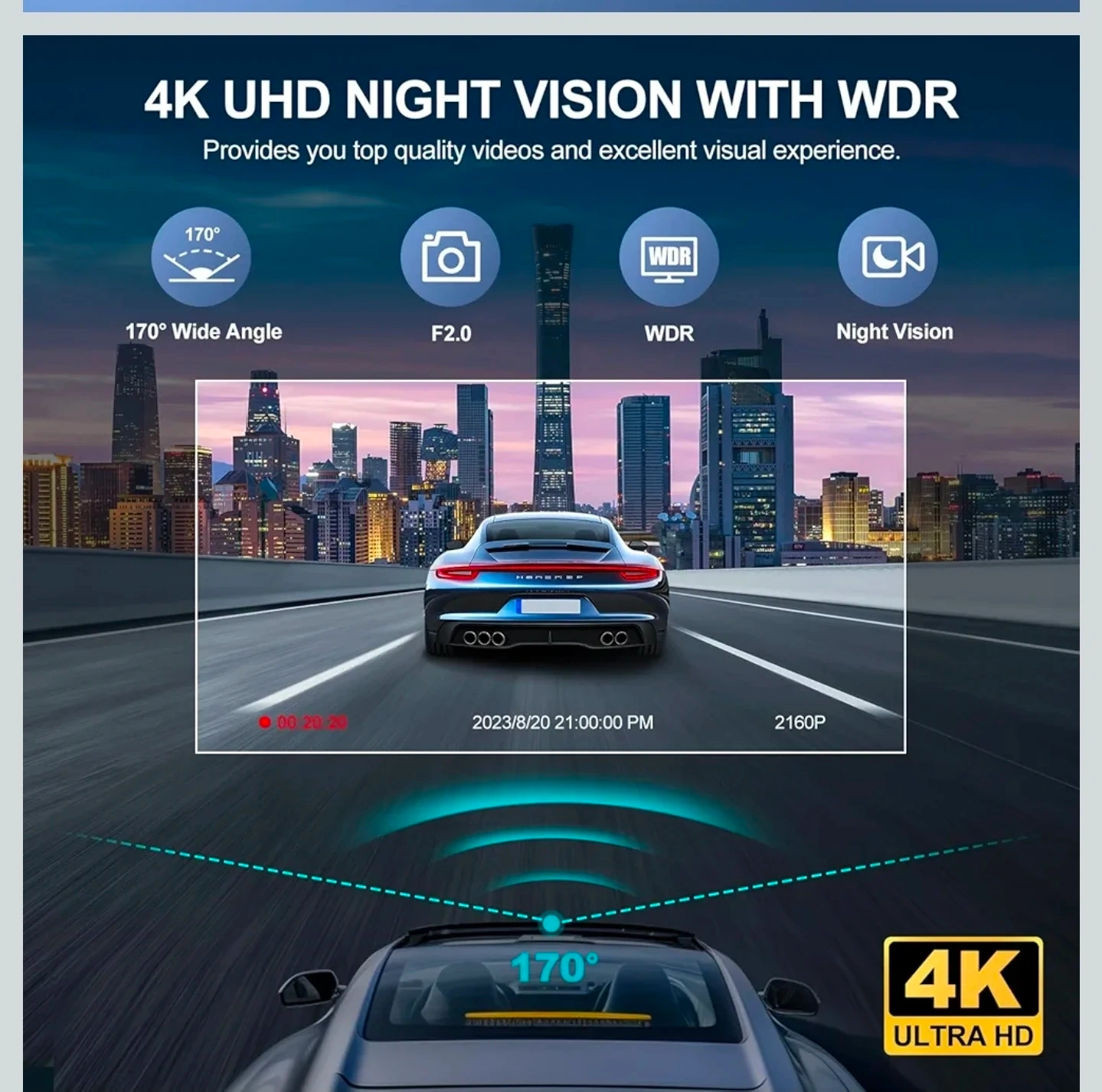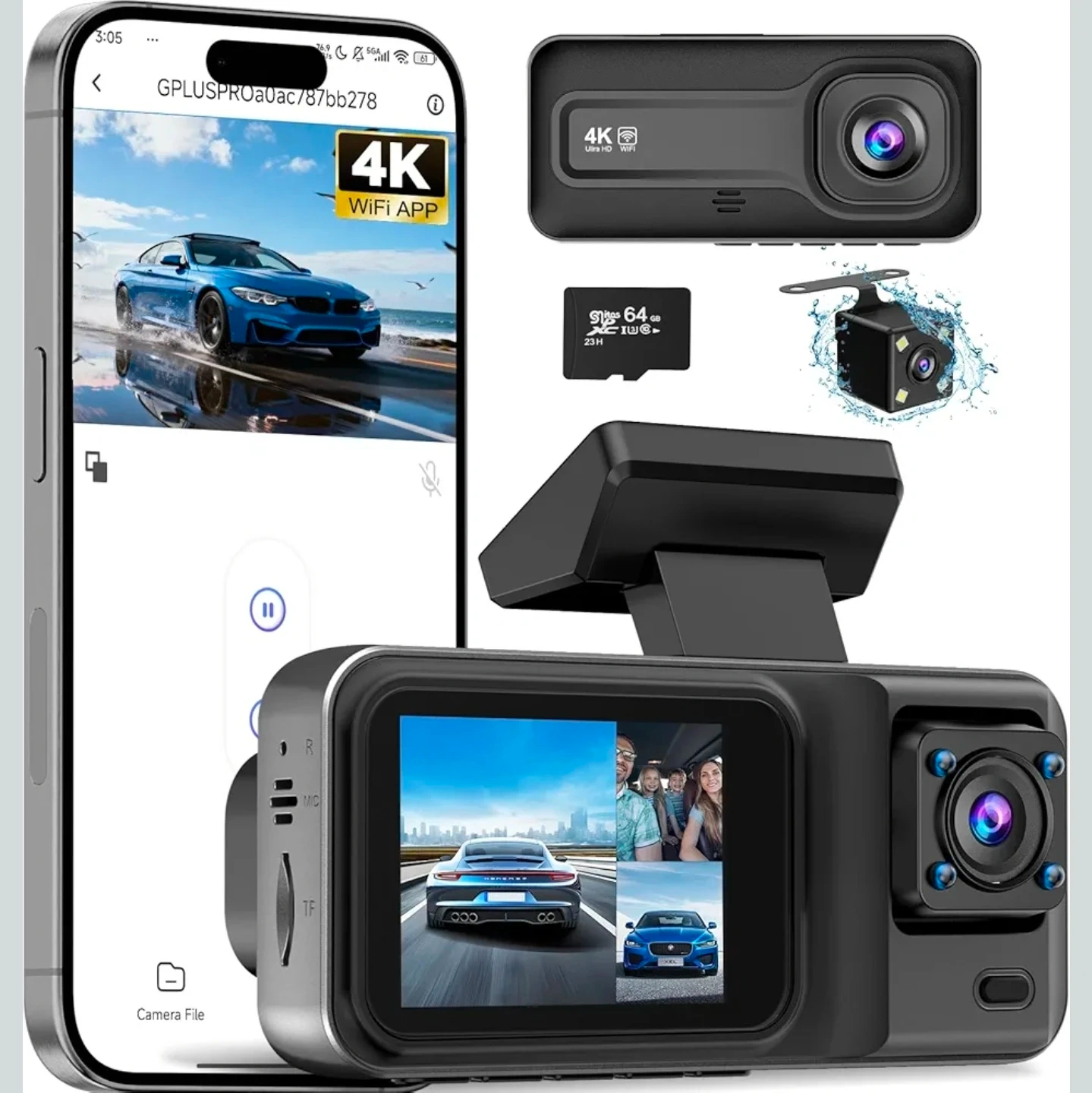3 Channel 4K Dash Cam with 5GHz WiFi & APP Control, 4K+1080P+1440P Dash Cam Front and Rear Inside with 64GB Card, Dash Camera for Cars with Night Vision, Loop Recording, G-Sensor, 24H Parking Mode