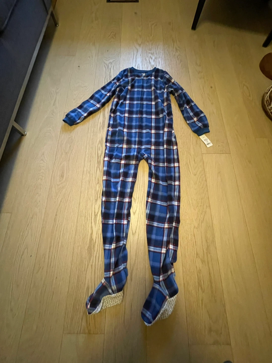 Snuggle up in these cozy plush footed pajamas! The blue plaid pattern is perfect for chilly nights.
