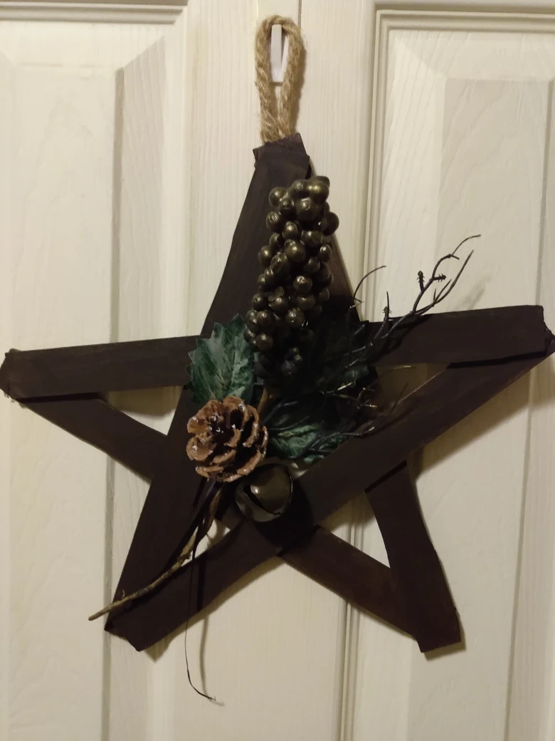 A beautiful rustic wooden star wreath, perfect for adding a touch of charm to your home decor. It features a dark brown wooden star adorned with decorative elements like a pinecone, faux leaves, and a small bell. Great for hanging on a door or wall!