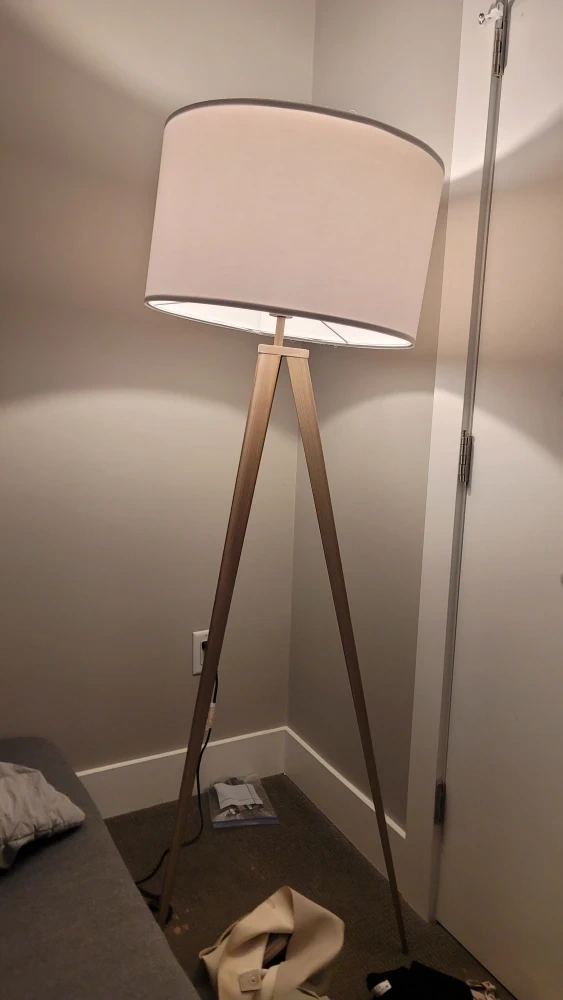 Selling a tripod floor lamp that's in excellent condition! It has a stylish and modern design that would look great in any room. The lamp features a sturdy tripod base and a neutral-toned shade, providing a warm and inviting glow. It's perfect for adding ambient lighting to your living space, bedroom, or office