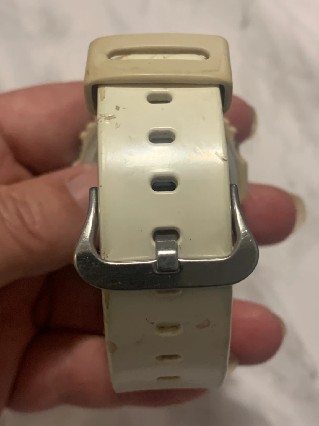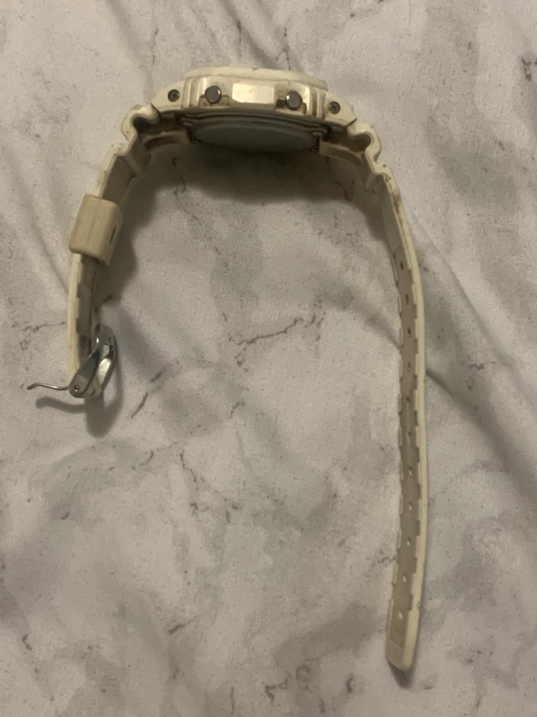 Casio G-Shock watch! It has a tough solar feature & is water resistant to 20 BAR. My dog unfortunately got to it & chewed the top right side of the wristband.