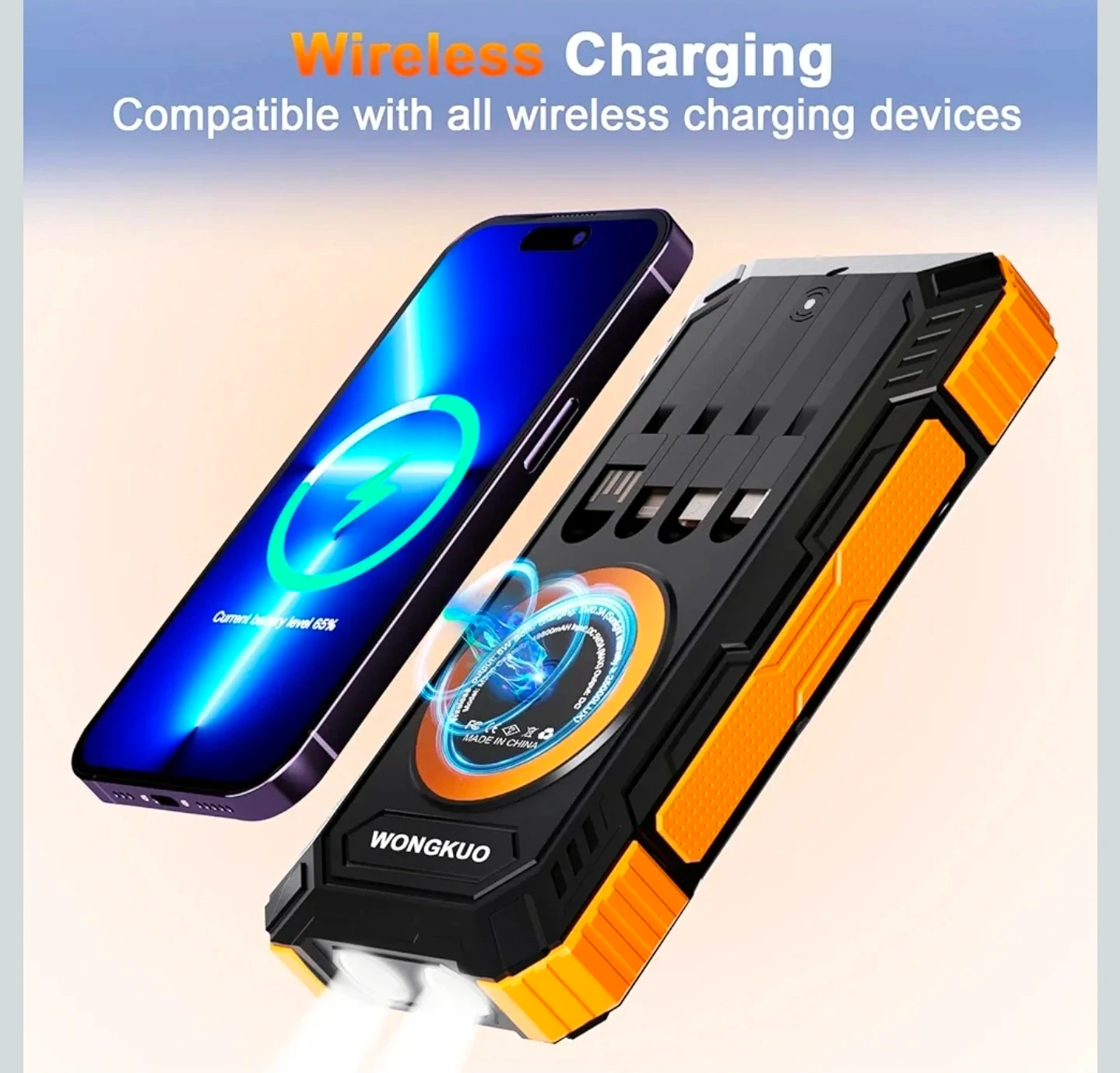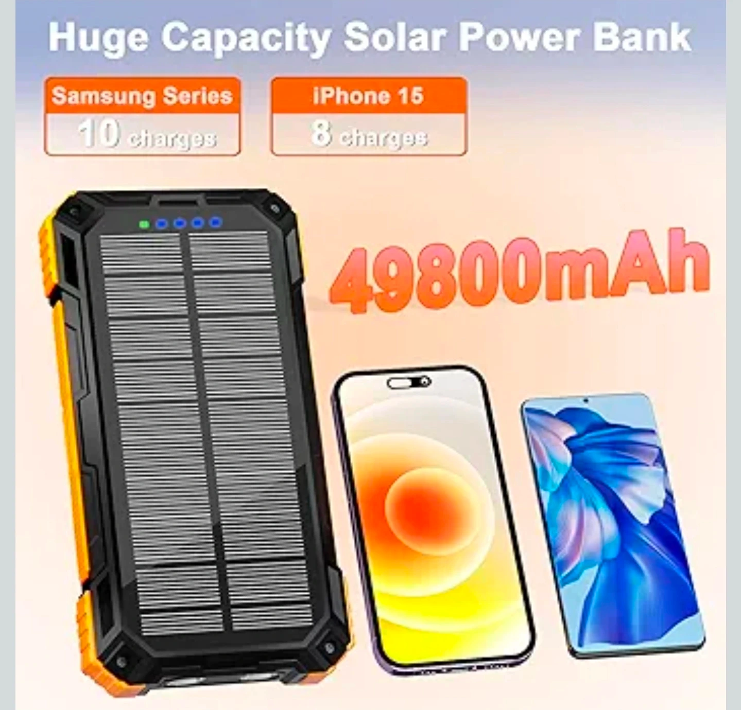 Solar Charger Power Bank - 49800mAh Solar Phone Charger with USB-C in/Output, QC 3.0 Fast Charging with LED Flashlight, Built-in 4 Cables, IP65 Waterproof Fits for Outdoor