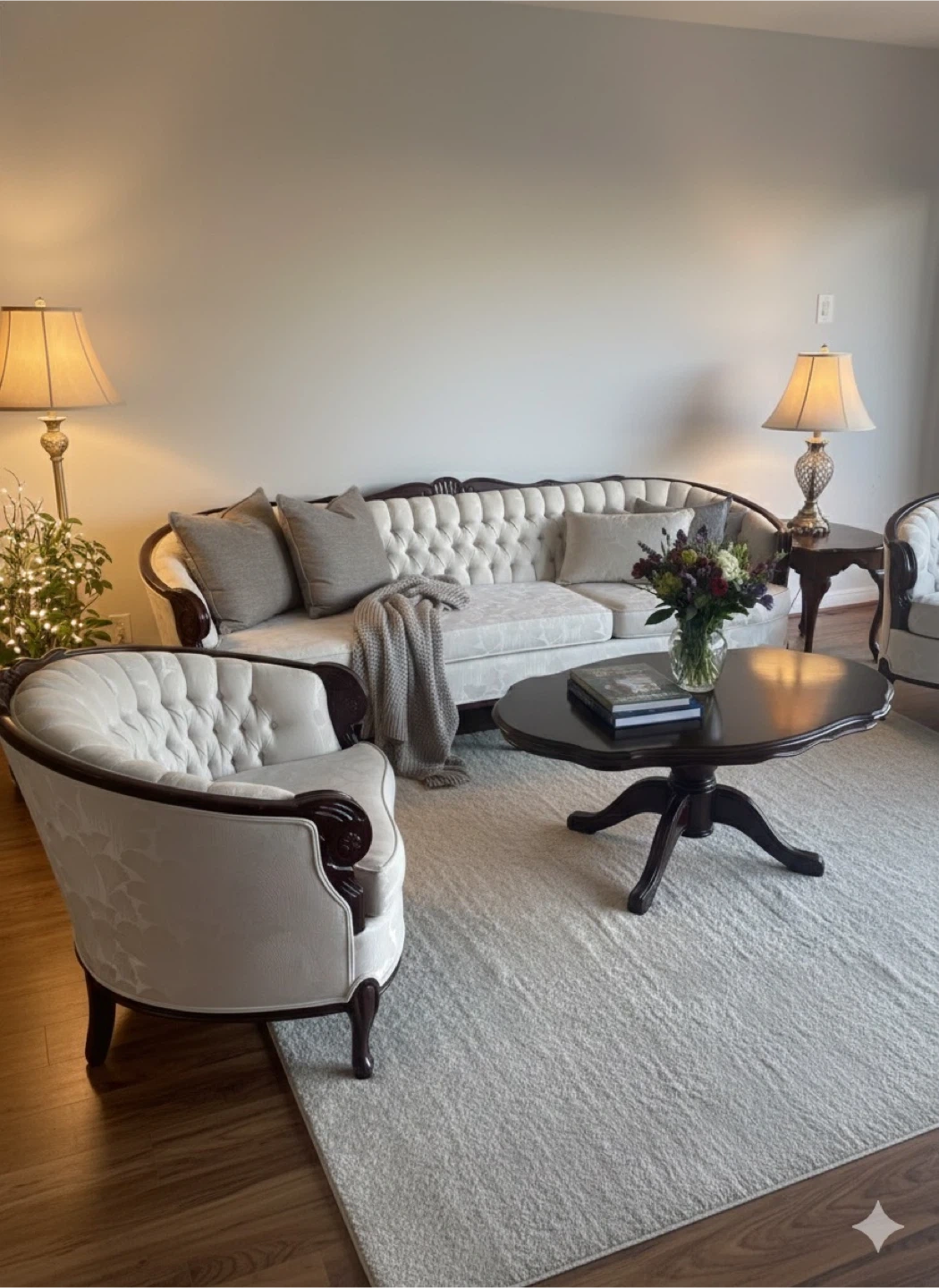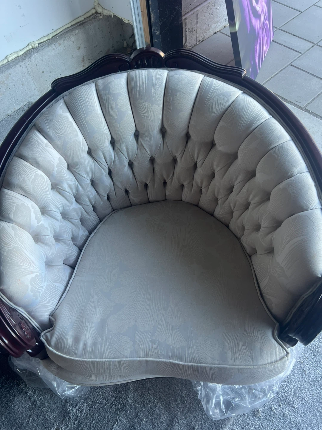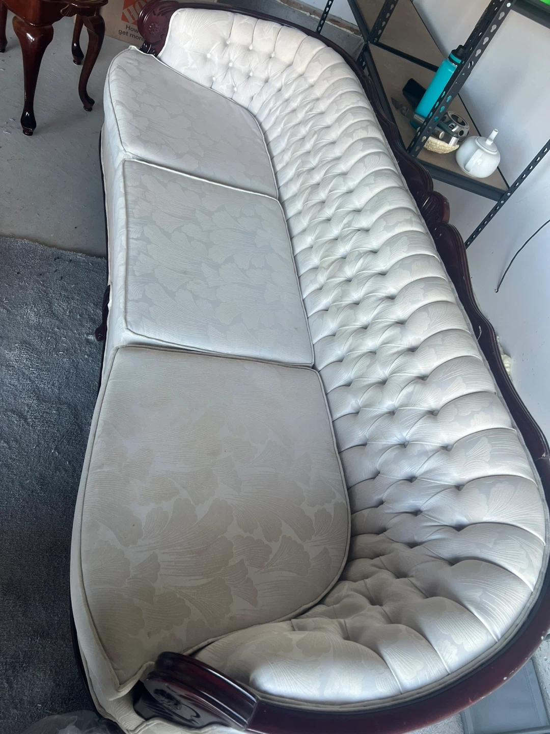 Selling a beautiful vintage-style sofa and chair set. The set features a tufted design and dark wood trim. Perfect for adding a touch of elegance to your living room! Plus coffee table and two side tables!