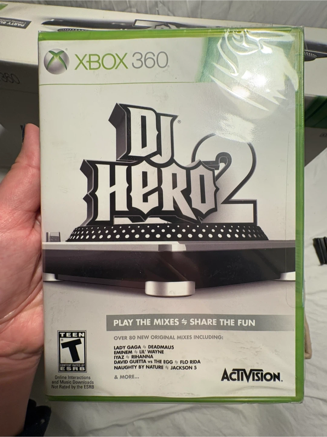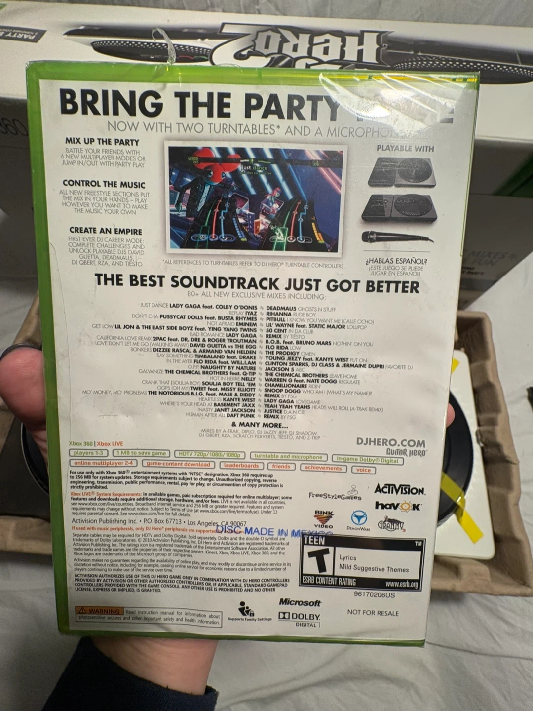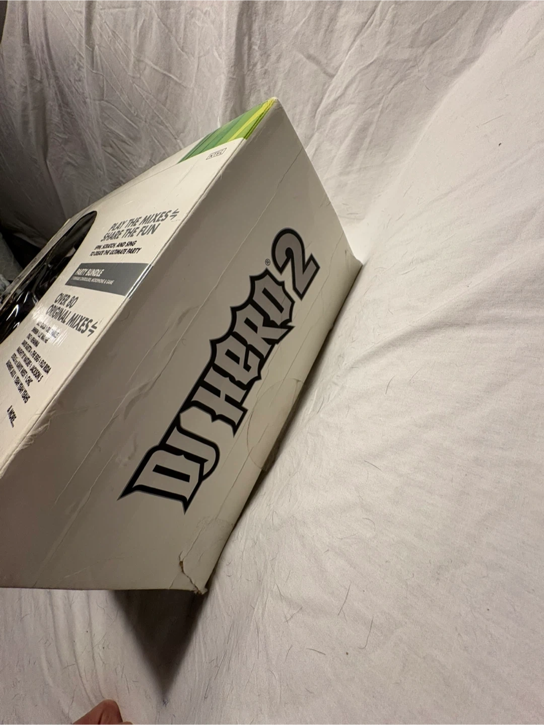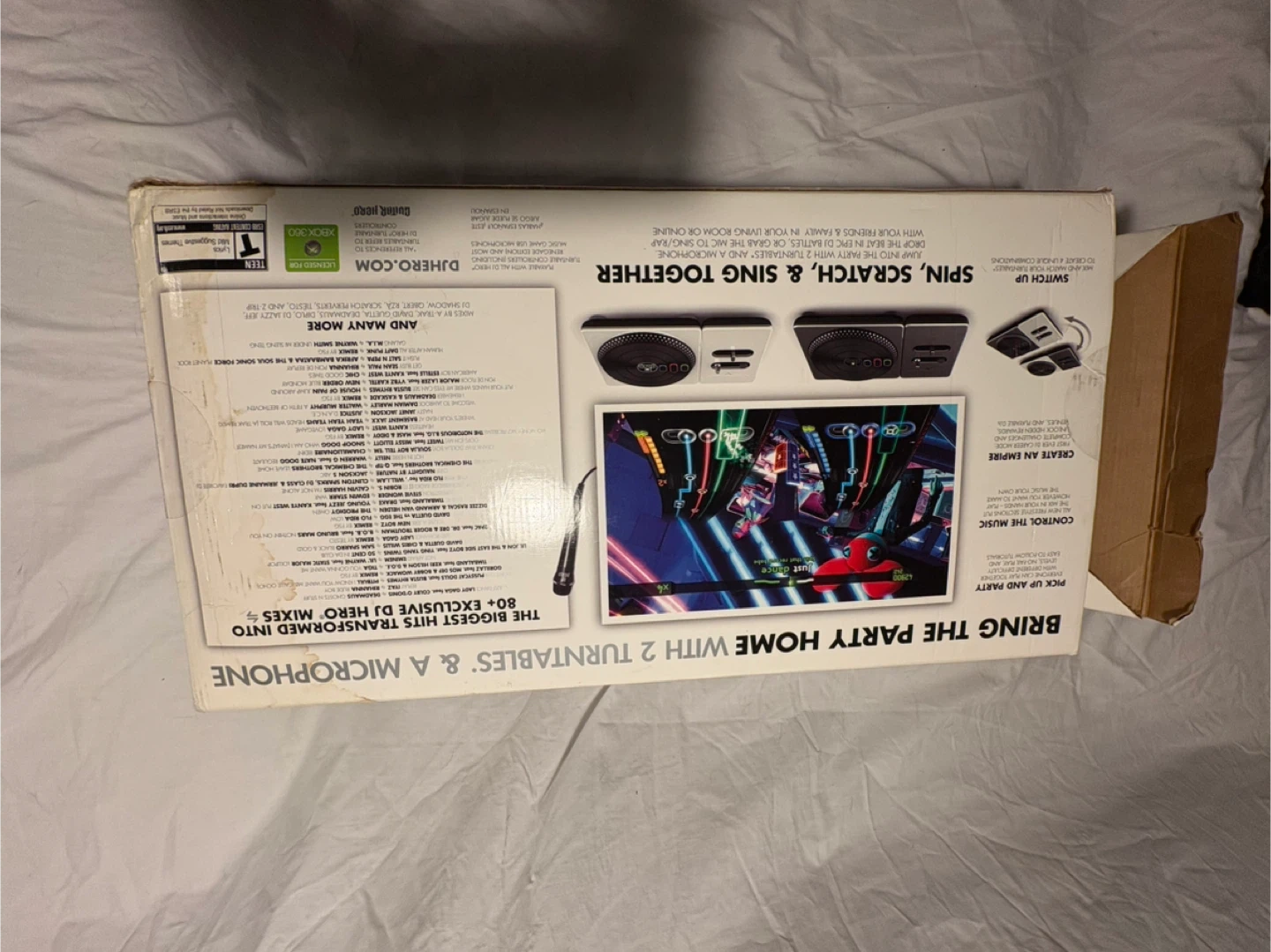 Selling a DJ Hero 2 party bundle for the Xbox 360! It comes with two turntables and a microphone so you can spin, scratch, and sing with your family and friends. Get ready to drop the beat and create the ultimate party with over 80 exclusive DJ Hero mixes. Box included