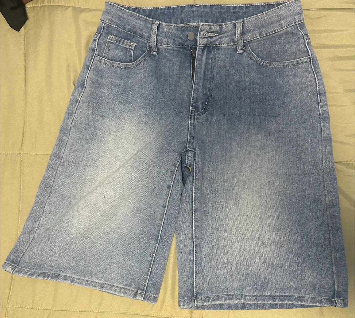 Selling a pair of denim culottes shorts! They're a stylish and comfy alternative to regular shorts, perfect for warmer weather. The denim has a nice, soft feel.