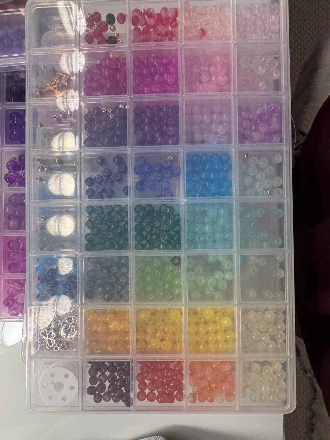Lots of beads in a plastic organizer! There are many different colours and styles of beads. Perfect for your next craft project