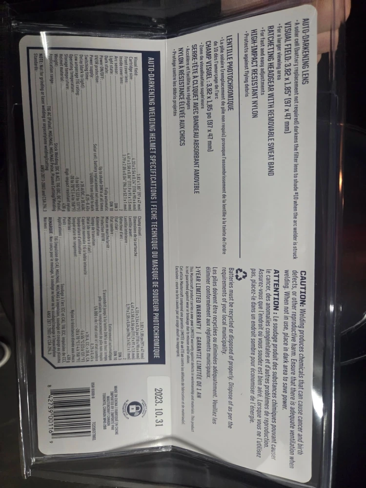 Selling a Mastercraft auto-darkening welding helmet. It has a fixed shade of #10. The visual field is 3.82 x 1.85 inches (97 x 47 mm). It also has a ratchet headband with removable sweatband for easy adjustments. The helmet has a high-impact resistant nylon shell. Retails for 90$ plus tax. See link below.
