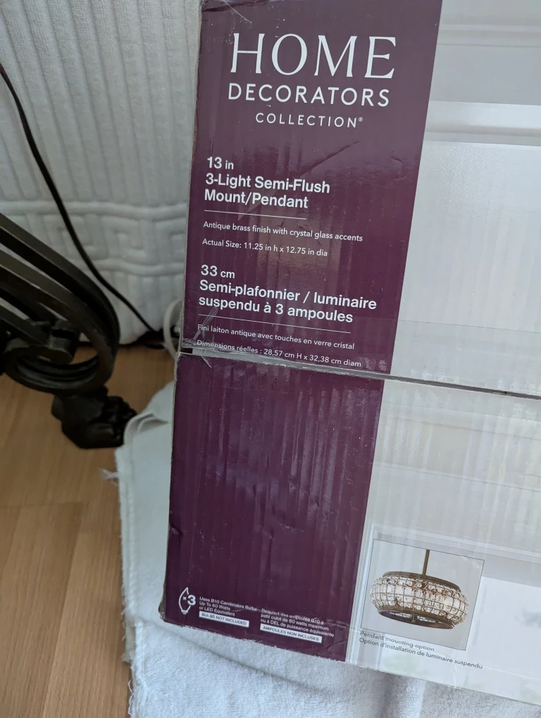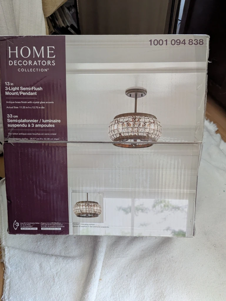 Selling a brand new Home Decorators Collection 13-inch 3-Light Semi-Flush Mount/Pendant. It features an antique brass finish with crystal glass accents. The actual size is 11.25 inches in height and 12.75 inches in diameter. Box included!