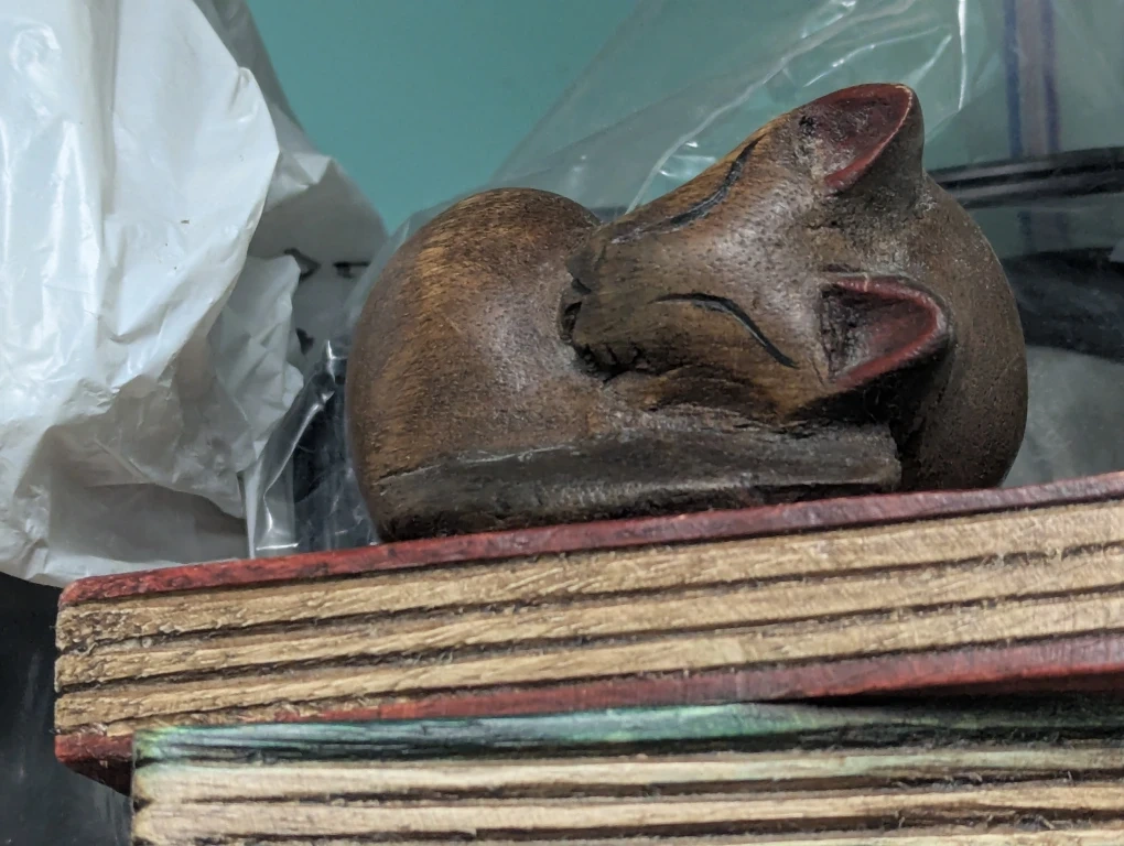 A charming wooden figurine of a sleeping cat resting on a stack of books. This unique piece would make a lovely addition to any bookshelf or desk! The wood has a nice, warm tone.