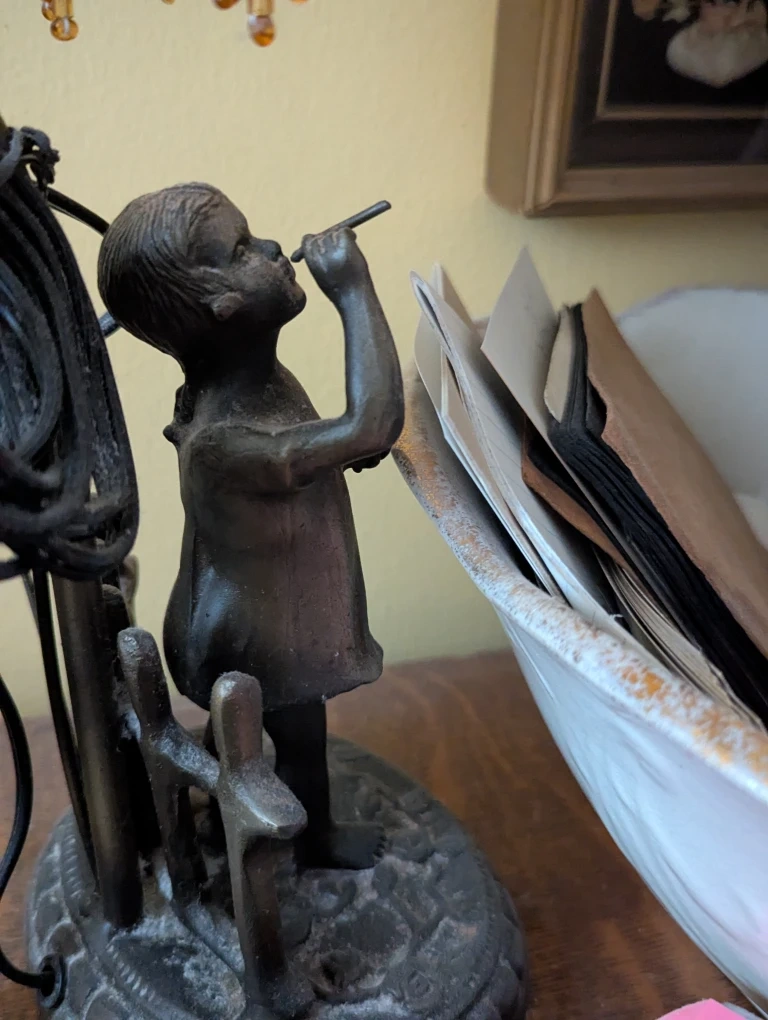 This is a charming vintage-style accent lamp that would look lovely in any room. It features a bronze-tone base with a figure and a beaded shade. It gives off a warm and cozy light