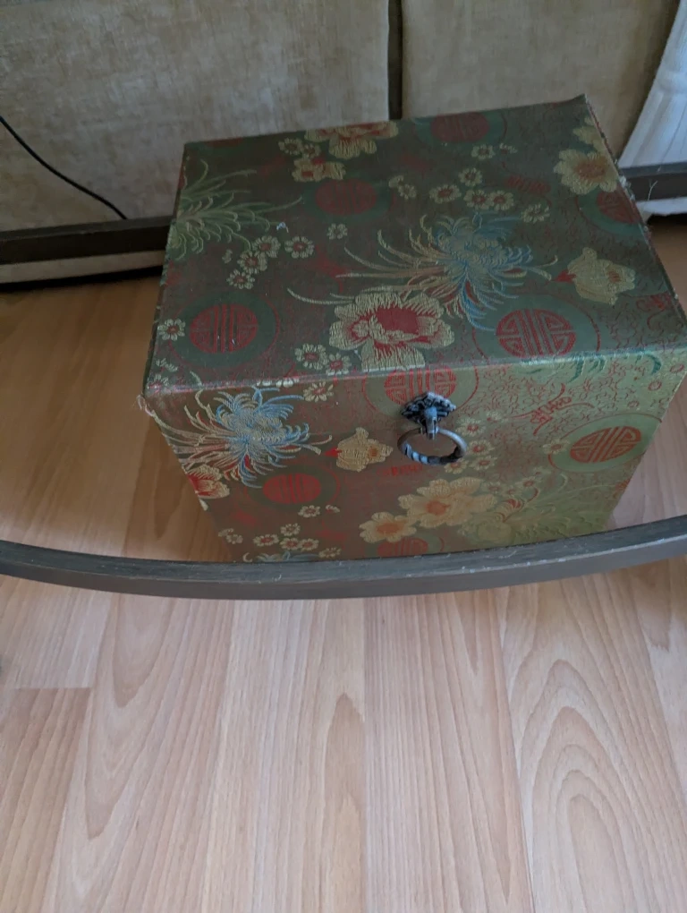 Here's a lovely decorative box with a beautiful floral pattern! It's in great condition and perfect for storing small items or adding a touch of elegance to any room. The box has a unique ring handle on the front, adding to its charm and the material is silk like.