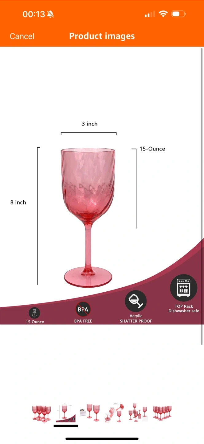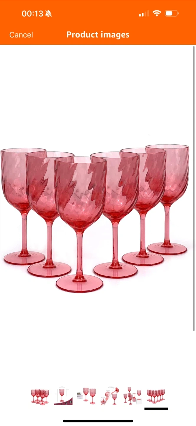 Selling a set of 6 pink acrylic wine glasses! These glasses are 15-ounce, BPA free, and shatterproof. They are also top rack dishwasher safe. Each glass is 8 inches tall and 3 inches in diameter. The body of the cup is one piece, with a smooth spout and heavy duty stability