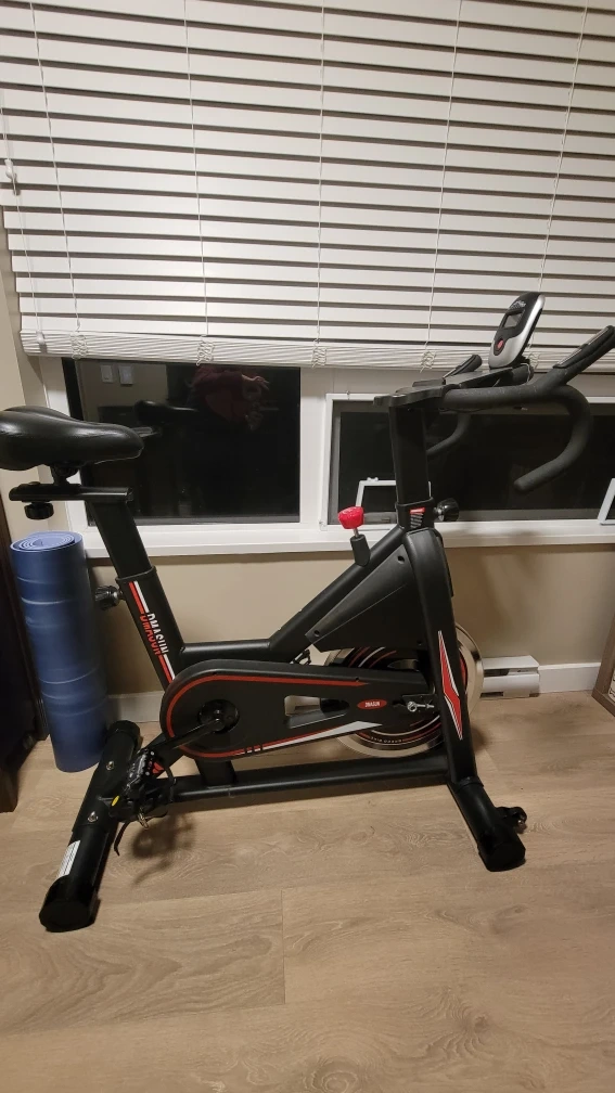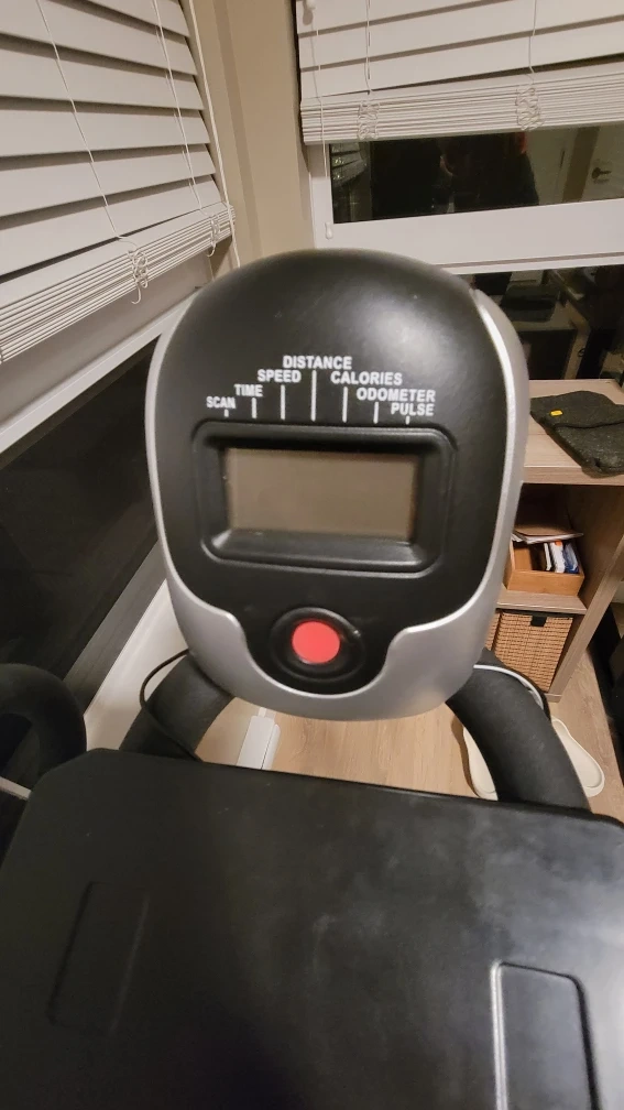 Selling a used indoor exercise bike! It's in good condition and ready for a new home gym. It features a display that tracks distance, speed, time, calories, odometer, and pulse. The bike also has a red emergency stop button for safety.