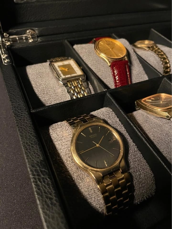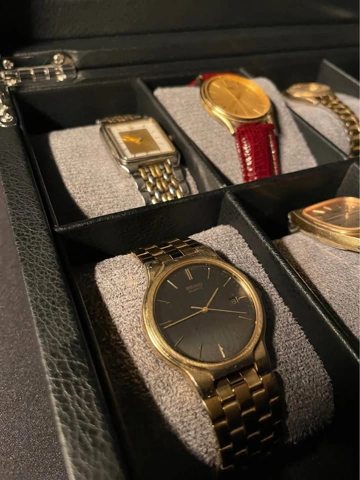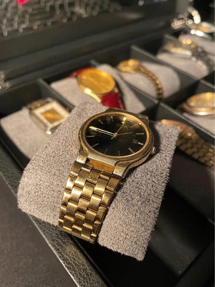 Clean black dial with gold-tone indices and hands, paired with a sleek gold-tone case and matching bracelet. The watch has a simple and elegant design, ideal for everyday wear or a vintage collection.