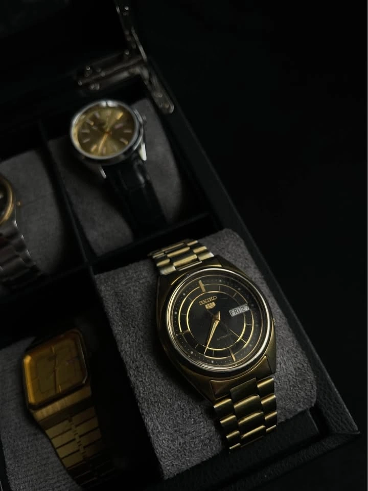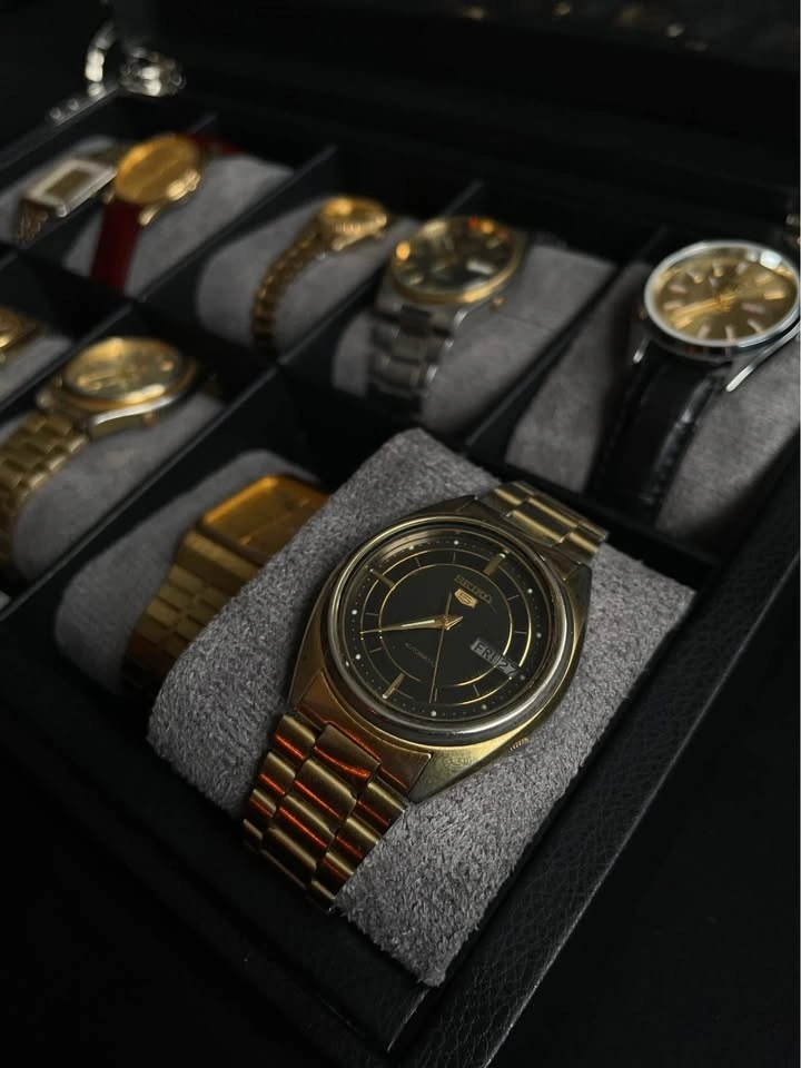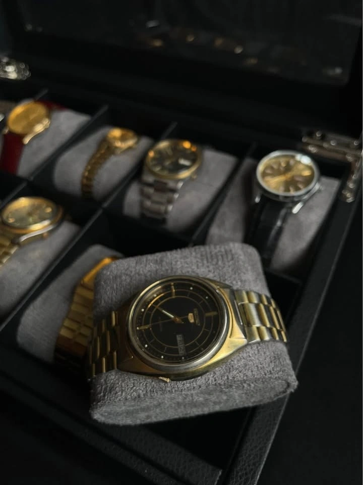 Runs great and keeps time accurately. Day and date functions change over as intended. Features a dark dial with gold-tone hour markers and hands, showcasing classic Seiko styling. Stainless steel case and bracelet with gold accents show light vintage wear. Reliable, eye-catching, and ideal for everyday wear or collectors.