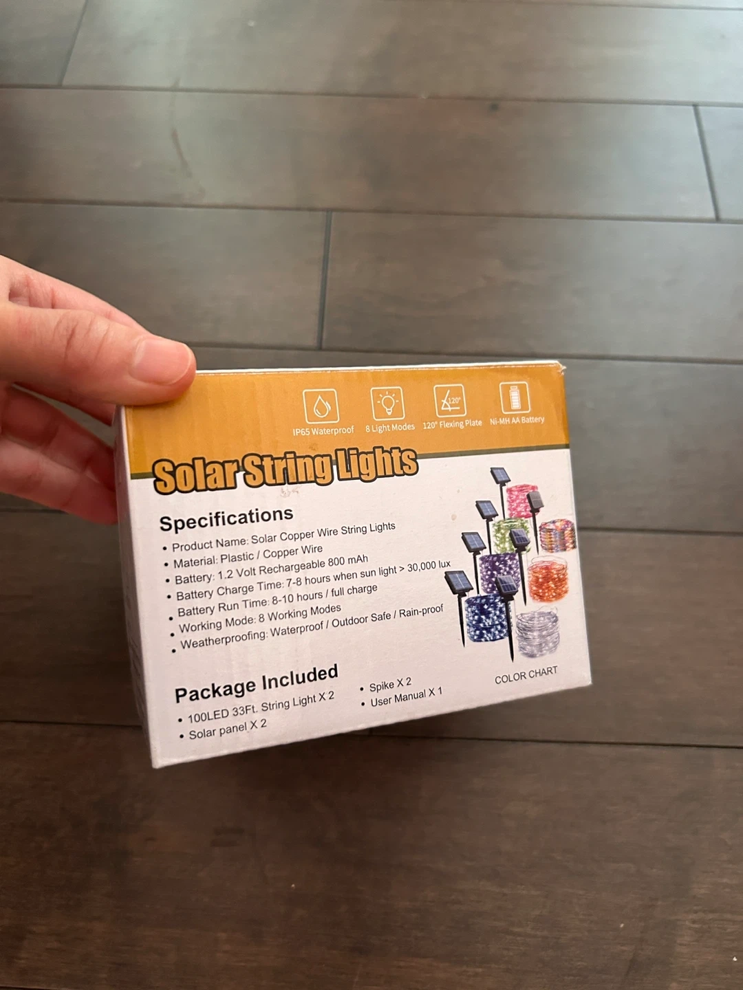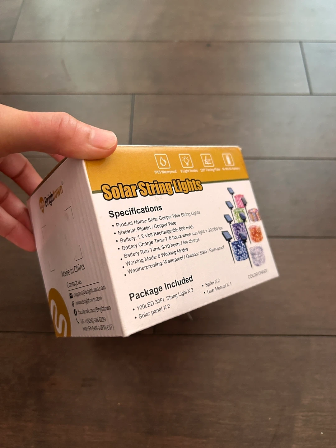 Selling a set of Brightown solar string lights! They're 33 feet long and come with 100 LEDs. The lights are made with a copper wire and plastic material, and they are weatherproof, making them suitable for both indoor and outdoor use. The package includes two 33-foot string lights, two solar panels, two spikes, and a user manual