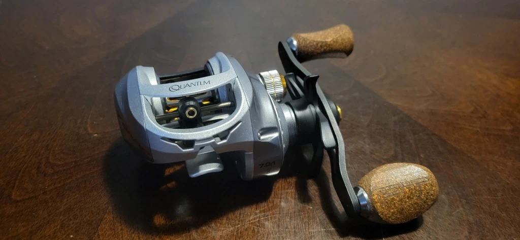 Here's my Quantum Baitcaster. It works great, it's smooth, it's built on an aluminum frame and holds lots of line. Other features include a carbon fiber handle and cork handle knobs. It's condition is pretty much mint because I honestly haven't used it that much(I have other favorites), and from not having it all that long it really has no real wear on it at all. I also oiled it and greased the gears out of the box which is something I like to do to all my reels when I get them.