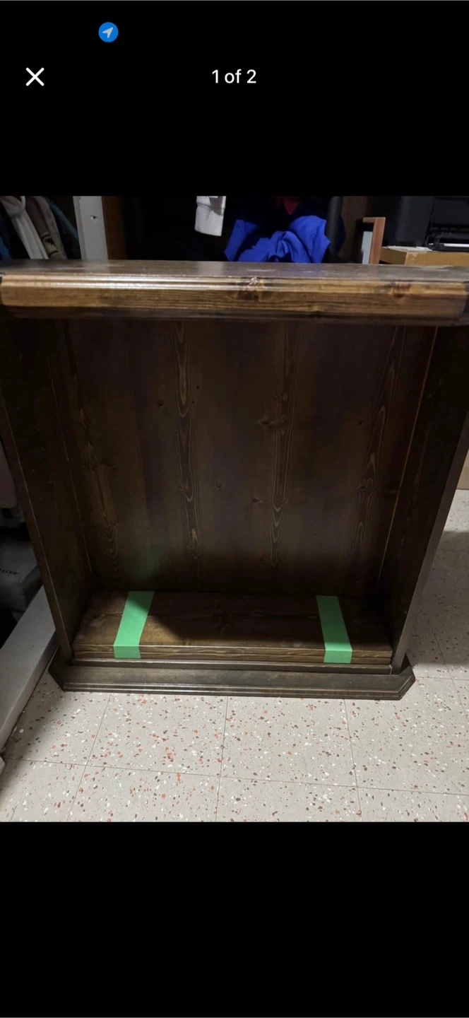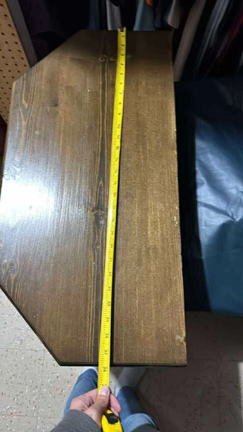 Selling a hand made brown wooden side table. It's in great condition and measures approximately 33 inches tall and 11 inches wide.