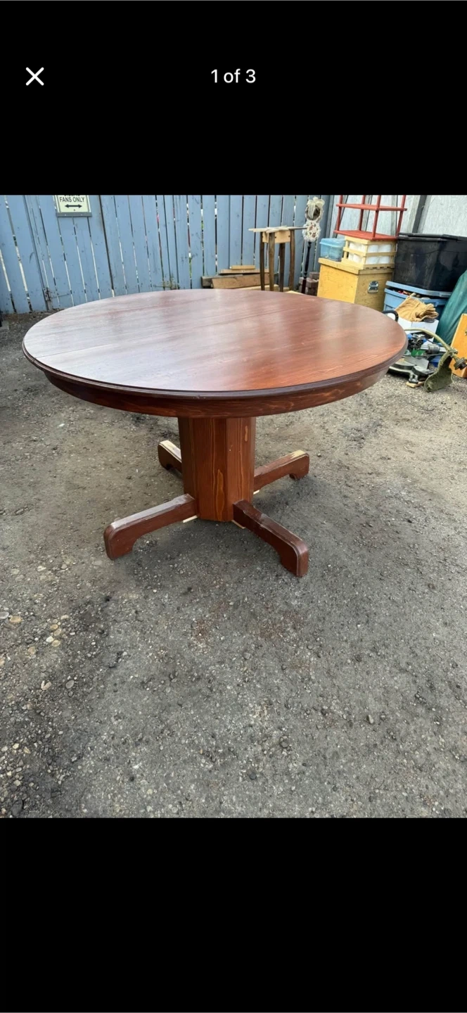 Selling a hand made wooden dining table. It's in good condition and would be great for a smaller dining space or kitchen. The table has a classic design and a sturdy base. Perfect for family dinners or gatherings with friends! Does not have chairs.