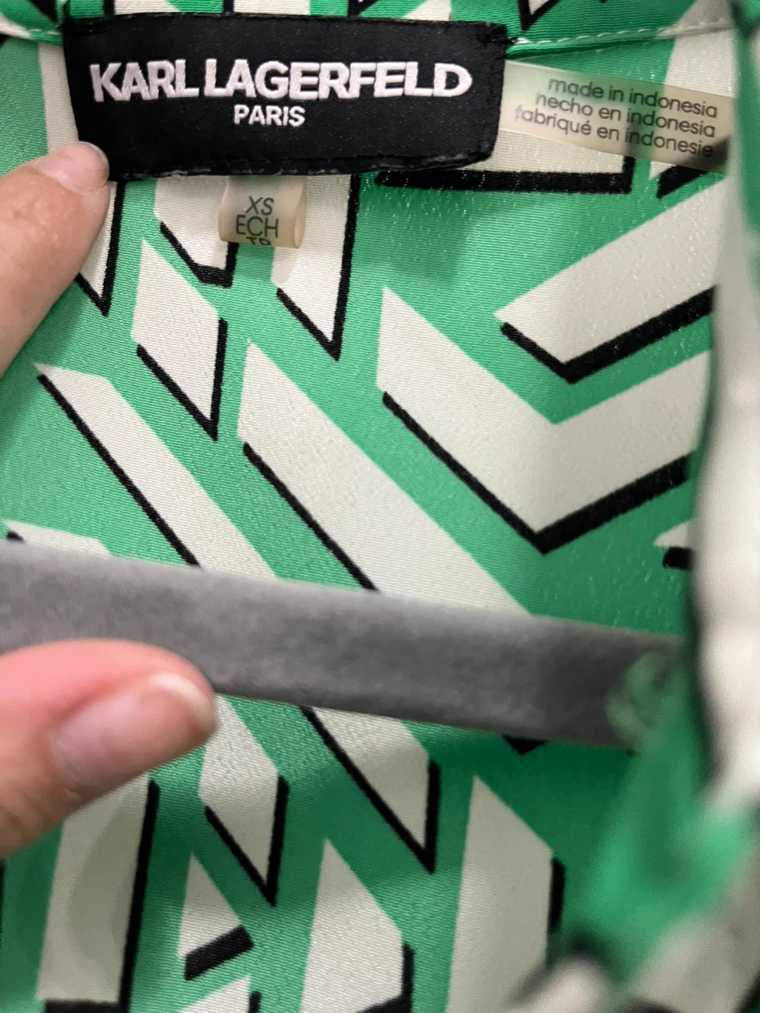 Selling a Karl Lagerfeld Paris blouse in size XS. It features a unique green and white geometric pattern. Perfect for adding a pop of colour to your wardrobe! Loose fit so can easily fit a Medium size. I wear medium but this fit perfectly