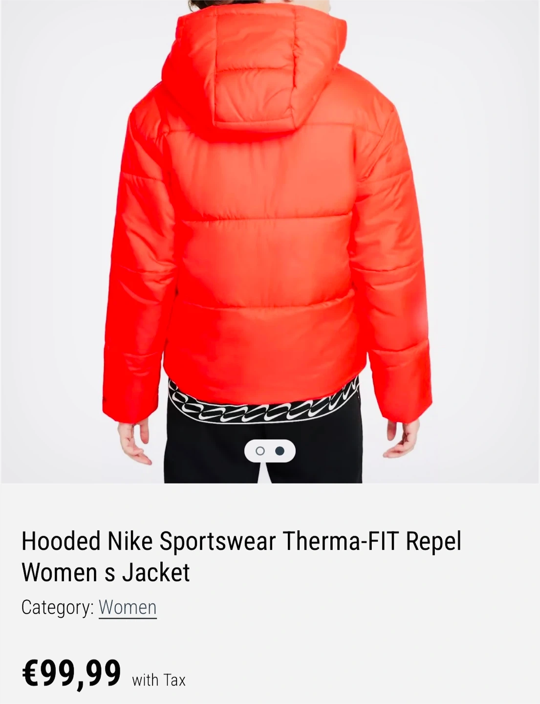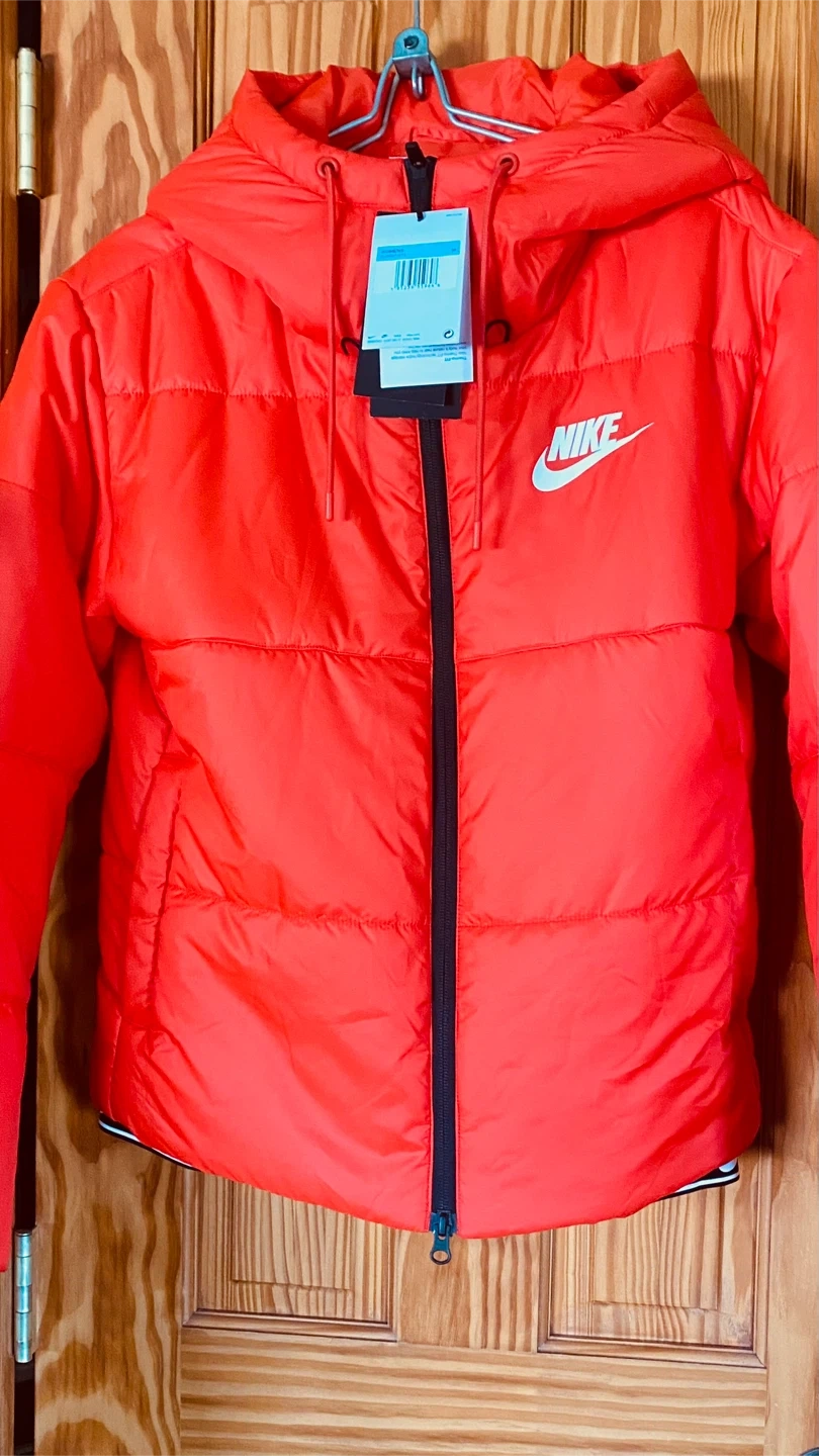 Selling a Nike Sportswear Therma-FIT Repel hooded jacket for women in size M. It's a vibrant orange color and looks great! The jacket is designed to keep you warm and dry, perfect for outdoor activities. Originally bought for €99,99.