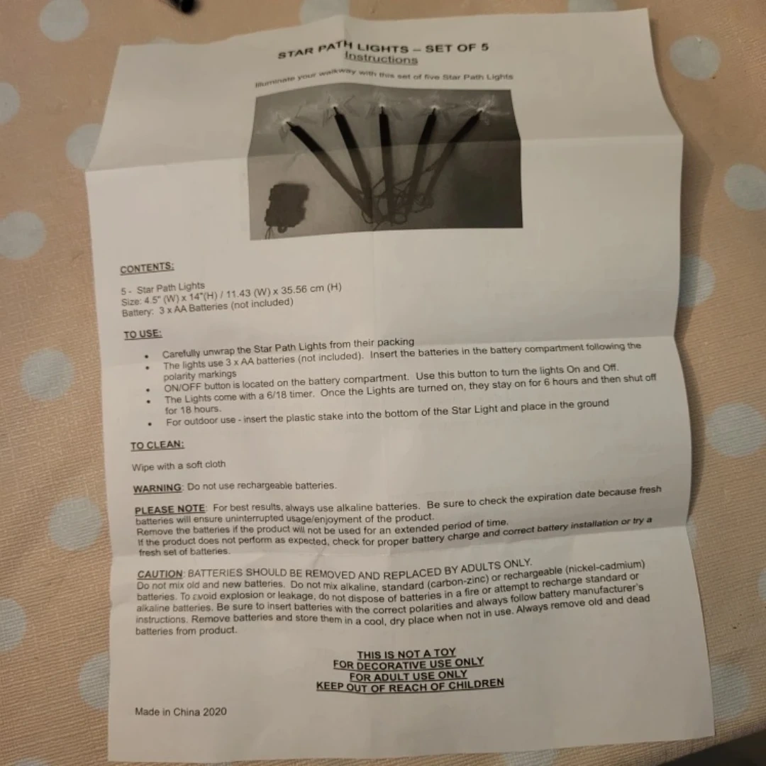 Selling a set of 5 Star Path Lights. They are 4.5" (W) x 14"(H) / 11.43 (W) x 35.56 cm (H) in size. Please note that batteries (3 x AA Batteries) are not included