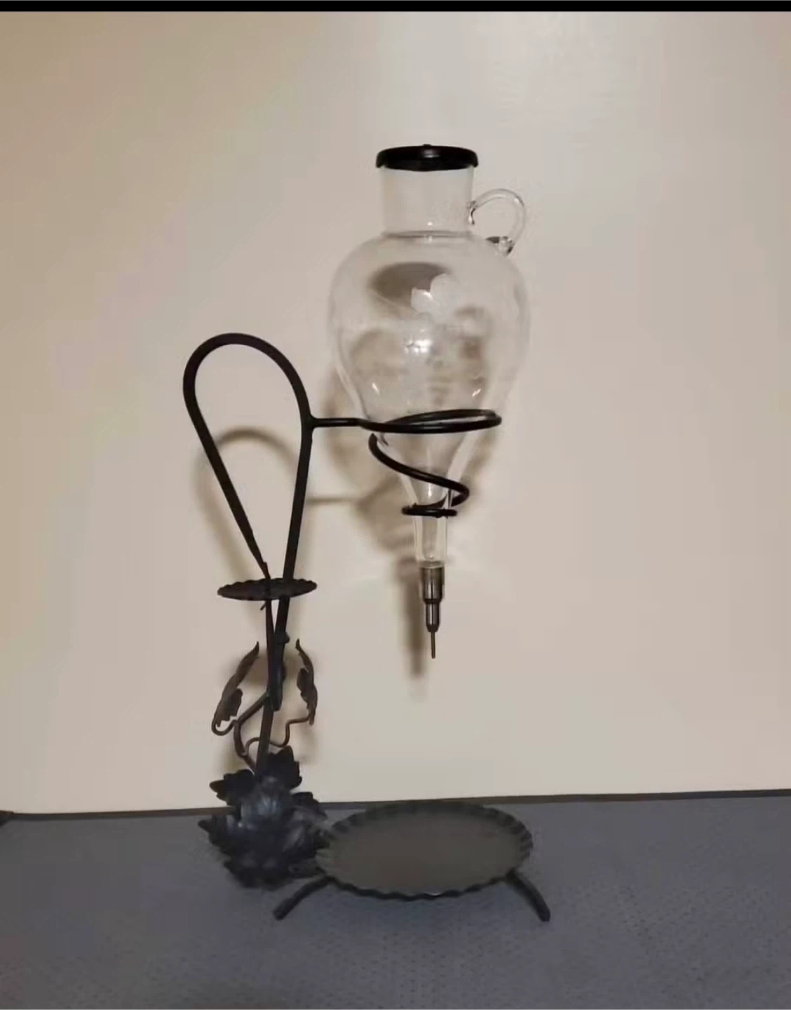 Selling a unique vintage glass decanter, complete with a decorative metal stand and spot for a votive candle. This piece would make a lovely addition to any home bar or dining area. It's in great condition and ready to be enjoyed!