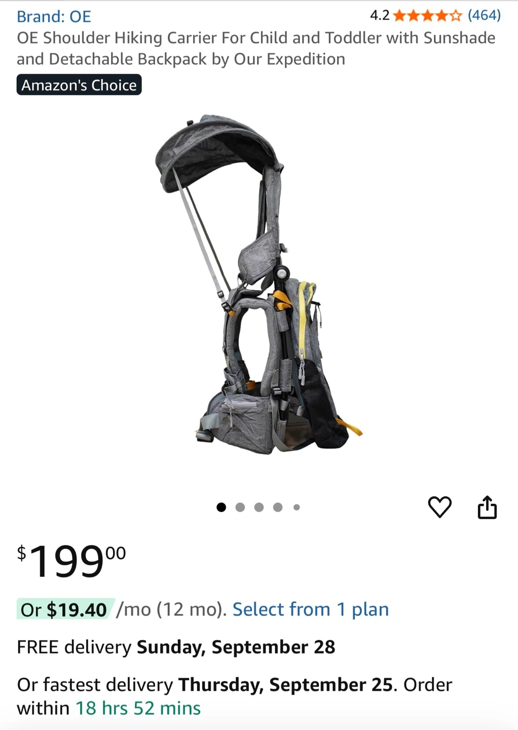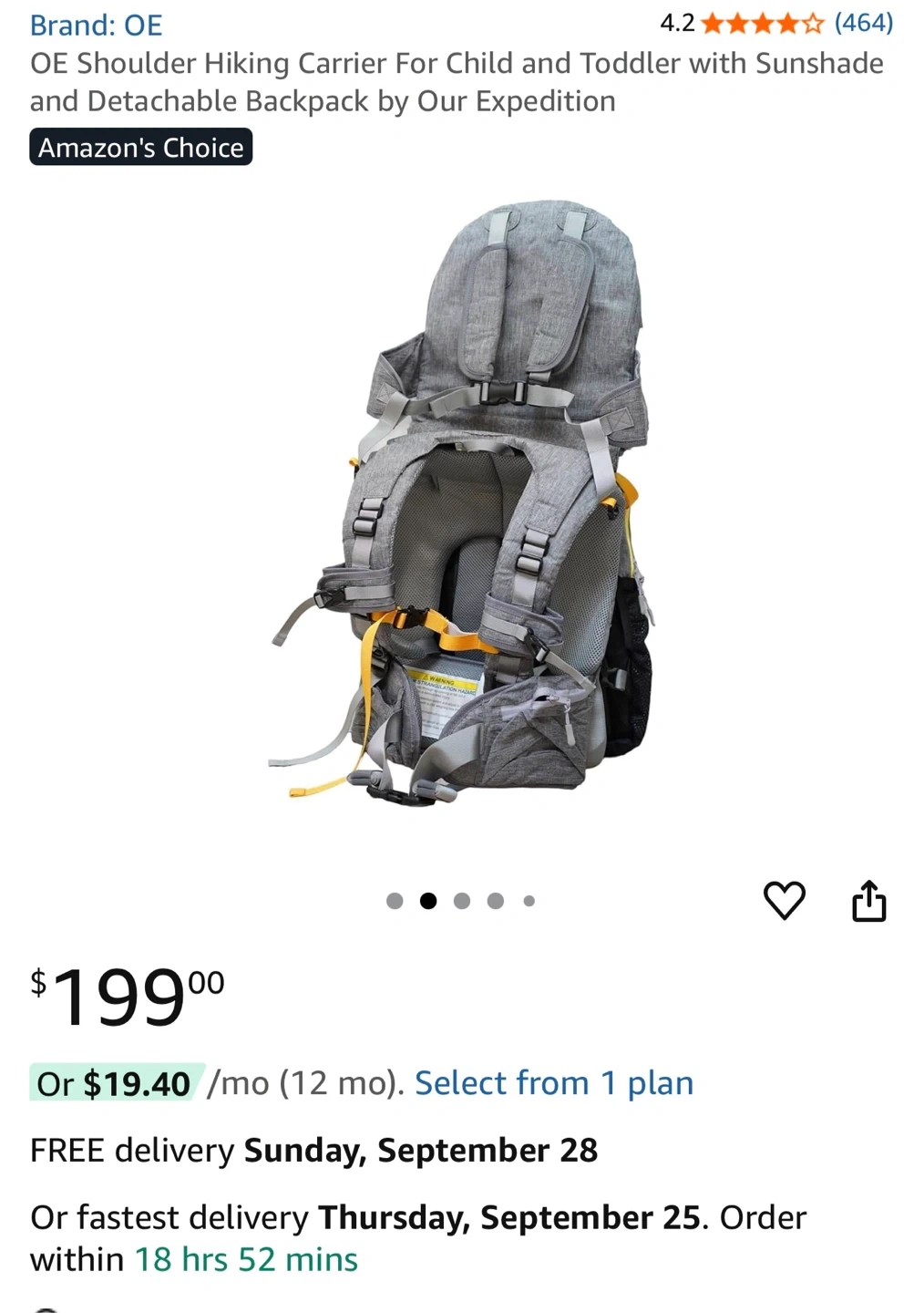 I'm selling an OE Shoulder Hiking Carrier for Child and Toddler with Sunshade and Detachable Backpack by Our Expedition! It's in great condition and ready for new adventures. Originally bought for $199.