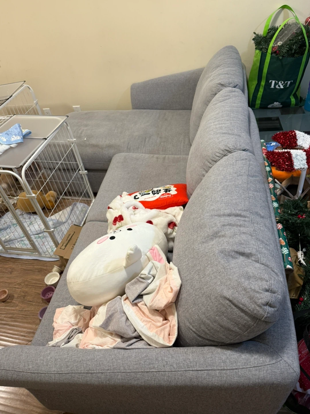 Selling a grey sectional sofa. It's in good condition and would be a great addition to any living room! It's a comfortable and stylish piece of furniture.