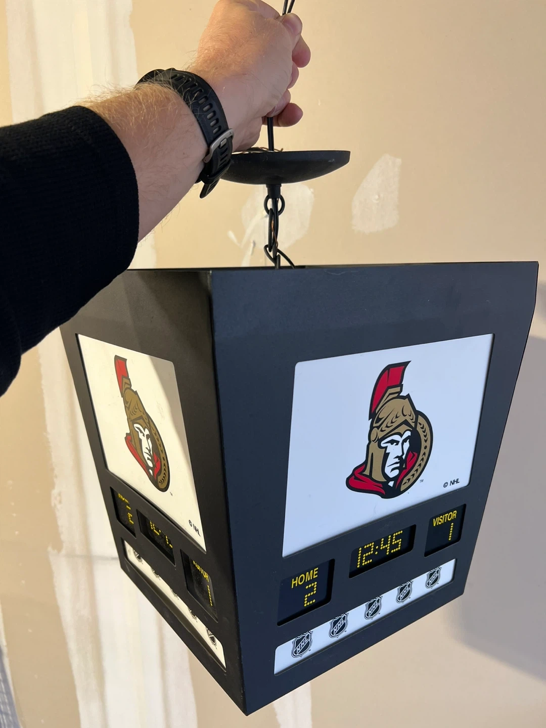 Selling an Ottawa Senators NHL scoreboard light fixture! It's a unique piece for any hockey fan's room or bar. It displays the Ottawa Senators logo and has a digital display for the score.